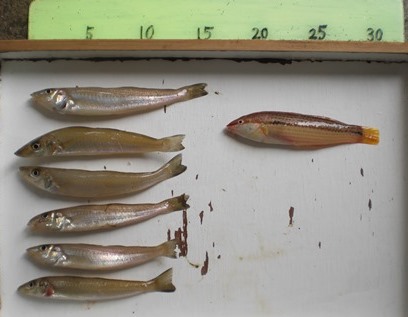 おはようございます。9月8日の日記です。やっぱり何かおかしい昨日、一昨日でした。今まで爆釣だった20cm弱のキスが2日間、見当たらないのです(泣)当店のベテランさんが苦戦している状況ですから何か異変が発生していると考えられます。どなたか思い当たる節はありませんかね。まあ、一時的なものだと思いますがね。しかし、釣りとは良くできたものでキスが釣れなくても変わりに釣れる魚が現れてます。一つはカワハギ。まだ、サイズは小さいですが食べられるサイズです。胴付仕掛け、一本針で釣られたり、ハゲ掛けで掛けている方も増えてきました。餌はシラサが一番ですが虫でも十分。餌取りの名人で鮮明なアタリはほとんどないので竿先に集中して釣れた時の喜びはひとしおですよ。後はアジ。時折り、30cmクラスも釣れ、これは嬉しい異変です。又、タチウオは指4本が釣れてますし。今の時期に。。。。ベラも今になって食い出してきました。。。自然は奥深いですね!では、昨日の釣果情報です。須磨のHさんは2時間程の釣行でベラの良型、カワハギ、サンバソウを手際よく、延竿で釣られました。きょうはエビ持参でカワハギ狙いです。みゆきさん、のんこさん、じゅんこさん、かおりさんの釣りガールがベラを釣ってくれました。お話では写真を釣る前、既に数匹、塩焼きで食べたそうです。せっかくの美女釣りガールでしたが顔写真を撮るのを忘れました。嫁がごめんなさいとお詫びしてます。次回はきちんと撮らせて頂きますので。。。続きまして滋賀のTさんご覧の通りの釣果でした。ピンギスは釣れるけど良型が釣れないと嘆いてました。結果はサンバソウ、ピンギス、カワハギ、カレイ、コチ、ベラ。。最後はお名前をお聞きするのを忘れまして済みません。見事な30cmのサヨリをお持込くださいました。ご覧の通り、丸々と肥えてました。キスも20cmをオーバーしていましたね。場所はマル秘との事で。。須磨駅前の防波堤でもサビキで数匹上げてましたので、撒き餌を切らさなければ釣れるんですけどサヨリ釣りの人は少ないですね。申し訳ありませんが今日は定休日で11時までの営業ですが宜しくお願い致します。