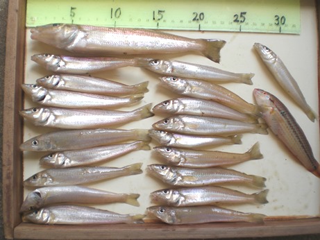 おはようございます。9月9日の日記です昨日の須磨のSさんの釣果写真が入手できました。昨日と同じ内容を再記載します。今年初の100匹超えの116匹。サイズは14センチ~17センチ。得意の延竿一本での釣果です。7時から8時まではコチばっかり45匹も釣れてポイント移動した所、そこで全てのキスを3時間程で釣り上げたそうです。餌は石ゴカイ。尚、本日もSさん、2時間程の釣行で同型のキスを30匹程、釣ってきてます。写真は編集後、アップしますので。そして昨日、大阪のFさんもキスの爆釣でした。餌は石ゴカイ。砂浜からのチョイ投げ。仕掛けは当店販売の流線6号2本針(6セット220円で販売中・・蛍光玉付)数は写真から想像してください。不調だったキスは須磨海岸に戻ってきてくれたみたいです。私には原因は分かりませんがこれが人間社会が踏み入れる事が出来ない大自然というものかもしれません。ぜひ、須磨のキス釣りの情報を入手の上、キスを狙ってください。では、今日も良き一日をお過ごしください。