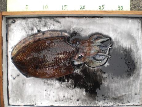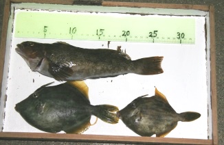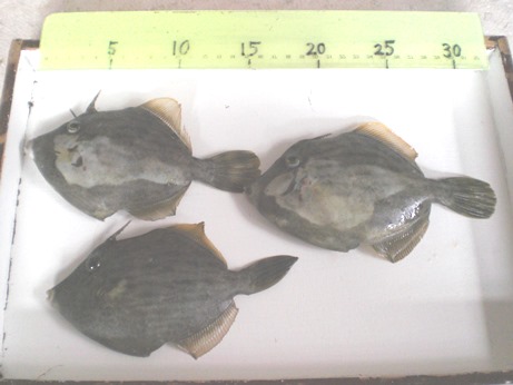 こんにちは。3ケ月の孫が帰省中です。目が見える様になってから初めての対面です。あやそうと愛想のいい顔を見せたら激しく泣かれてしましました。やっぱり私って女性には持てないオーラがでているんですね(泣)雨が降ったりやんだりの今日の12時までの釣果です!立派に成長しているカワハギの良型をおすそ分け頂きました。サイズは18cm。写真以外にも16匹、釣れたとの話です。良いポイントを見つけましたね。餌はマムシでした。旬のカレイの釣果もおもちこみ頂きました。サイズは23cmながら丸丸としたメタボカレイです。同じポイントに投入して両目が開いたとしてやったりの表情でした。以上、速報です!