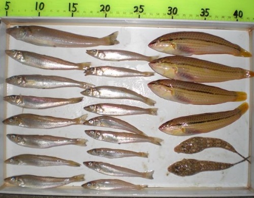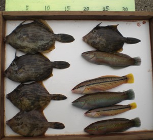 おはようございます。11月30日の日記です。私毎ですが昨日、フィットネスクラブで体成分を測ってもらいました。筋肉が増加、脂肪が減少してまして体重が1Kg減でした。結果、体脂肪率が20%から18%になりました。これから体力を蓄える為に筋肉を増やし、体重増加が目標です。魚の方も今のカレイは肉厚でこれから産卵で痩せたカレイが釣れます。食べてみたら味も食感も全く異なりますので今のうちにぷりぷりのカレイを狙ってくださいね。釣り人は尼崎のUさん25cmの肉厚カレイです。もう一匹は自然放流してしまったと仰ってました。目の前でバラシです。逃がした魚は大きい?!嬉しさも半減でしたネ。次回、竜宮城へ連れて行ってもらいましょうか?寝屋川のHさんはキス狙いでポイントを探しましたがこの結果でした。まだ、ベラが釣れているから水温は高いのでしょう。でも、キスはどこにいるんでしょうか?今日、来られた親子のお客様は午前中、釣れなかったけど午後になり、急に釣れだし、おまけで息子はカワハギも釣ったと報告してくれました。釣りは奥深いですね。最後は防波堤周辺で探り釣りの釣果です。お名前を聞き忘れましたが好青年2人組ですシラサを餌に若さで釣った魚だとの談でした。明日から寒くなるそうですので釣行の際には防寒対策をお忘れなく。では、せっかくの好天をうまく利用してくださいね。