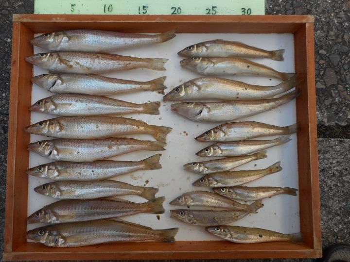 吉川釣具店です5月22日の日記です20、21日は雨、風でお客様は少なく、釣果はありませんでした。そんな中、夕方から出かけられた次郎君のパパがアジ狙いで来られ、釣果を送ってくださいました。頂いたコメントを抜粋してアップします。20年ぶりの釣り再開とは感慨深いものがあるでしょうね。**************************漁港内で夕方から15〜18cmのアジが8匹釣れました。強い風が止んで、穏やかな波になったほんの30分間の釣果でした。釣りを20年ぶりに再開して、昨年秋11月12日の駅前近投での32cmカレイ以来の楽しい釣りでした。アドバイス頂き有り難うございました。今後ともよろしくお願いします。*******************************好調なキスも上がってます大阪のUU様小型はリリース後の釣果です。食い込みが悪かったので仕掛けをキス針6号に落とし、待つ釣りで掛かりが良くなったとの談。一転、好天に恵まれた22日はキス、アジ共に好調でした。特にキスは21cmを頭に22匹の人も。写真は明日、アップしますね。