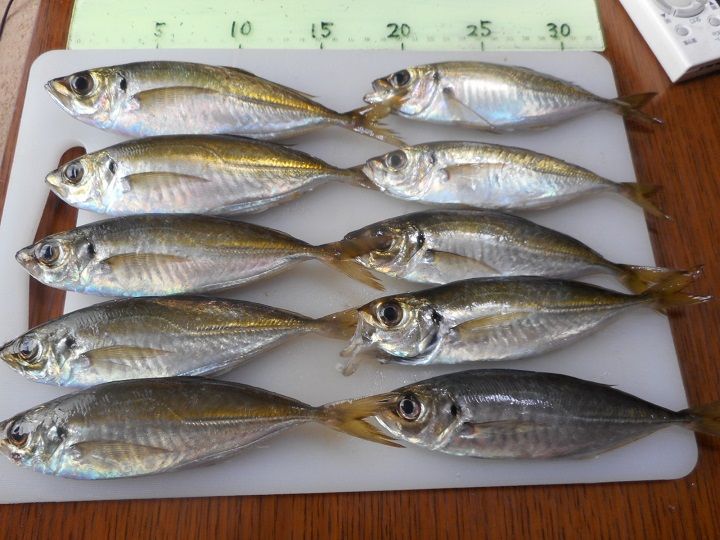 吉川釣具店です。5月28日の日記です。昨日は定休日。本日は雨。お客様は少な目です。そんな中、昨日お越しくださった女性が豆アジを釣られメッセージを頂きました。抜粋してご紹介します***************************昨日、閉店時間過ぎてたので遅ればせながら27日の釣果をお知らせします。教えていただいた場所で、豆アジ27匹、ガシラ3匹でした。ガシラ2匹は小さかったので返しました。温度が急激に上がってきた8時頃(?)に一度群れが止まりましたが、1時間くらいして、またパラパラ戻ってきてくれました。海の透明度が高く、アメフラシやイシダイ?かウマズラハギ、キス等々が見えて楽しかったです>゜)))彡またお邪魔しますのでどうぞよろしくお願いします。*******************************キスが泳いでいるのが見えるなんて、まるで水族園?管理人としては是非、お子さんに見せてあげて欲しいものです。逆に雨が降ったら濁りが出て、透明度は下がりますが海に養分を与えてくれ魚の活性があがります。神秘的で自然を感じさせてくれる海に感謝です。
