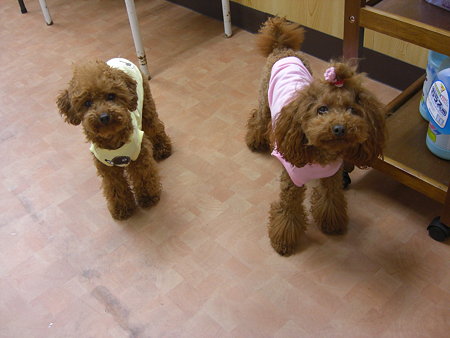 またまたご無沙汰です(≧ω≦)先週もコロチロも私も元気に過ごしておりました昨日は4/30ぶりにコロンをシャンプーまだお客さまのワンちゃんはカットできないけれどハサミの持ち方、使い方を練習しておくのはということで初めてハサミを持たせてもらいましたヽ(´▽`;)ノお顔のカットは店長にお願いしましたでっかいマズルとしっぽ、長いお耳はキープしたままで…チョキチョキ自己流でやっていた時とは持ち方が違うのでなかなか思いどおりに手が動きません…(≧ω≦)練習あるのみ~~~ チロルのカットはまた後日練習する予定です 先日、そんなコロチロ家にプレゼントが届きました『ブログにUPする時は名前は伏せて』と言われたのですが…分かる方には分かるかなww(゚m゚*)コロチロお揃いの手作りお洋服です可愛い~~~~~どっちもぴったりサイズでした~~~いい感じに着画にならなくてごめんね いつも応援してくれてをくれるcちゃんほんとにいつもありがとう~~~ヾ(≧▽≦)ノ゛ランキングに参加しています是非ポチっと1クリックして帰ってくださーい(*´▽`)『いつもありがとうございますm(u_u*)m』ワンちゃんとオーナーさんがお揃いを楽しめるアクセサリーショップわんわんJewel らぶりぃ姉のブログもよろしくですv(・∀・*)私の甥っ子のりゅうちゃんと1月に生まれた姪っ子のまなちゃんの日常ブログりゅうまな日記