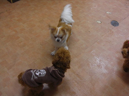すっかりおサボりブログになってますヽ(´Д`;)ノお友達のブログにもなかなか遊びに行けなくてごめんなさい日曜日は久々にパパさんと一緒にお休みでした午後からはパパさんが剣道の講習会に行ったのでバンダナを編みながらコロチロとお留守番夕方は天神公園にお散歩に行ってきましたそこでなんとチロルは近寄ってきたワンコとご挨拶ができたんですーーーあまりに突然すぎて写真が撮れなかったけど、パパさんもビックリヾ( ゚д゚)ノ゛でも相変わらずお尻をクンクンされるのは苦手みたいでギャーギャー騒いでたんだけどね… 帰宅後の満足そうなコロン(゚m゚*) 店長のお友達のももちゃんがサロンでの様子をこっそり撮ってくれてたので載せちゃいまーす全身ピンクのユニフォームなのが私(゚m゚*)その後ろでコロンに手を伸ばしてるのが店長ですwwそしてももちゃんのわんこ☆ハチ蜂になってまーす(≧m≦*)こちらも店長のお友達のわんこ☆アイアイ笑顔が可愛い~~~(≧▽≦)2ワンコとも、先週私がシャンプーしたのですがとってもお利口さんでした~(*´▽`)b今週も頑張るぞーーーランキングに参加しています是非ポチっと1クリックして帰ってくださーい(*´▽`)『いつもありがとうございますm(u_u*)m』ワンちゃんとオーナーさんがお揃いを楽しめるアクセサリーショップわんわんJewel らぶりぃ