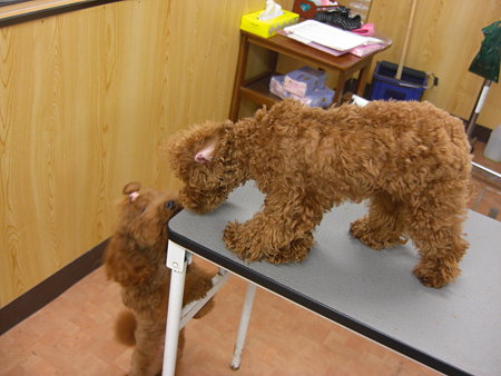 23日でトリマー見習いを始めて半年になりました5~6ヶ月で新しく習ったことはバリカンですいつも店長の流れるような手さばきを見ているはずなのにいざ自分がやろうとするとどんな風な持ち方なのかも全く分からず何気なく見るのではなく、しっかり学ばなくてはと思いました。。。24日、コロンの薬用シャンプー6回目。 体のバリカンを教えてもらって、体に初のバリカンがけ今回はお顔はピーナッツカットにしてもらいました 25日の通院で、5日おきにシャンプーするように言われたので28日に薬用シャンプー7回目。この2ヶ月、洗いすぎて毛がパサパサだったのでこの日は保湿効果のある(ノルバサン)で洗ってポンポンの傷んだ部分をカットしました チロルは27日に洗ってポンポン以外を少しカット リボンは練習用の少し硬めのペーパーだとだいぶ早くつけられるようになってきました 今日はフィラリア投薬日今月はワンコホットケーキに忍ばせて投薬~ 店長のワンコ、チロルの赤ちゃん3ワンコ。フードを食べ始めました~~~よく動くので体重を量るのが難しくなってきました長男≪仮名:クッパ≫ 800g超え~次男≪仮名:カルビ≫ カルビも800g超え~三男≪仮名:キムチ≫ ちょっと小さくて600g超え~相変わらずチロルは赤ちゃんに興味津々ですww 29日はお休みだったのでコロチロにお留守番してもらって、店長のお友達のmocoちゃんとせっちゃんとランチに行ってきましたせっちゃんにもらった嬉野温泉のおみやげのおまんじゅうと馬油石鹸ヽ( ・∀・)ノいつもありがとう~~~ランチの後は美容院でカット&パーマしてきましたしっかりリフレッシュできたので次の休みまで、また頑張りまーす(*´▽`)いつもレス遅くて、なかなか訪問もできなくてすみませんm(u_u*)m応援感謝してますランキングに参加しています是非ポチっと1クリックして帰ってくださーい(*´▽`)『いつもありがとうございますm(u_u*)m』ワンちゃんとオーナーさんがお揃いを楽しめるアクセサリーショップわんわんJewel らぶりぃ姉のブログもよろしくですv(・∀・*)私の甥っ子のりゅうちゃんと1月に生まれた姪っ子のまなちゃんの日常ブログりゅうまな日記サロンで出会ったお友達mocoちゃんのブログもよろしくですv(・∀・*)ミニチュアダックスのハチとmocoちゃんのブログmoco☆moco diary