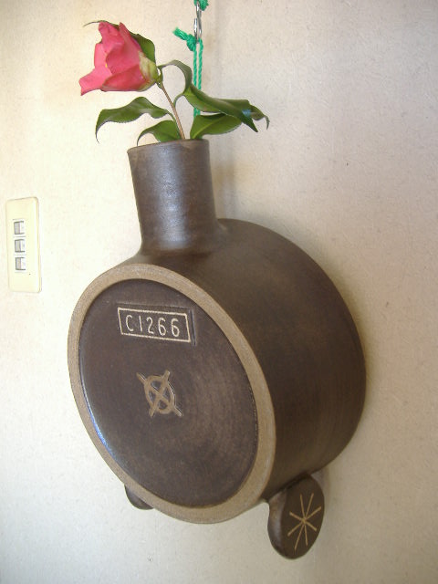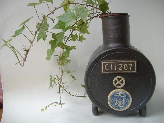 新しい機能を付けました。輪挿し、鉢植え、香炉、蚊取り線香、インテリアの5way SLC1266です。焼き物に光沢を出している釉薬は、雑木の灰と真岡鐵道で実際にSL C1266で使われた石炭灰をブレンドして使い、1240度で焼き上げ、煙で燻して赤黒い色を出しています。幅25cm×高さ38cm×奥行22cm
