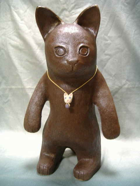 この作品もシーサーと同じ窯で焼きました。シーサーと同じ作り方の手びねりで、頭、胴、腕、尻尾、足の中は空洞です。 幅23cm×奥行29cm×高さ38cm ホームページは『3point3』 ←ここをクリック