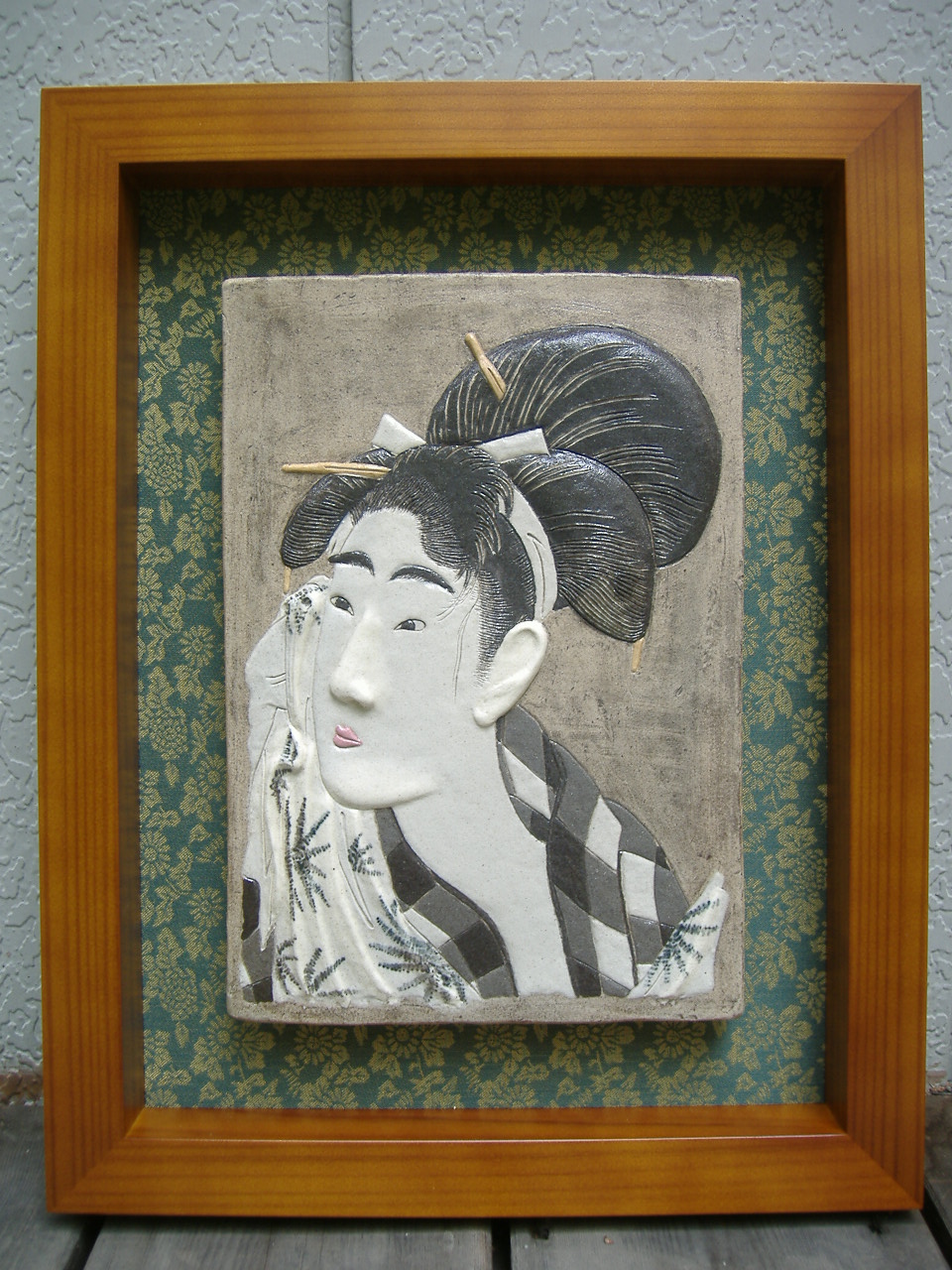 喜多川歌麿「咲分け言葉の花・おちゃっぴい」の浮世絵をレリーフ陶板にしました。レリーフ陶板 たて34.5cm 横25.5cm額縁込み全体 たて56.5cm 横46cm使った粘土は鉄分の多い赤土、鉄分が少ない並土、黒泥、信楽土、カラー粘土(ピンク、黄、水色、紫)で、透明釉を掛けて1240℃で焼き上げた陶器です。版画の浮世絵を粘土を盛ってレリーフにするわけですが、いわゆる粘土の状態のものを盛る方法と、泥漿状態のものを流し込む方法があり、輪郭や線を表現する手法は、大きく分けて、掘り込み、盛り土の二つで、全部で五つほどあり、使い分けます。額装も自作。陶板背景の畳縁は色が豊富で、一般的には一枚の布で額装するところを、この作品の様に2種類の畳縁を使う発想も、畳縁であればこそ出来ることです。額縁は、杉材を使った「浮造り」といって一般的には、バーナーで杉を炭化させブラシ掛けして、木目(年輪)を浮かび上がらせる手法ですが、私は、年輪と年輪の間の白く柔らかい部分を、木切れや竹串で強くこすりつけ、へこまして「浮造り」風にしました。この手法の利点は、柔らかい杉の表面全体が緻密になり固くなることです。色付けは、古民家の柱、梁が煤で黒光りしているのを再現したくて、書道に使う墨を塗り、蜜蝋ワックスで磨きあげました。版画の浮世絵は、絵師、彫師、摺り師の共同作業ですが、三者によって摺られた版画の浮世絵を元に、私、盛り師がレリーフ陶板にしました。喜多川歌麿「辻君」の浮世絵をレリーフ陶板にしました。レリーフ陶板 たて34.5cm 横25.5cm額縁込み全体 たて55.5cm 横45.5cm