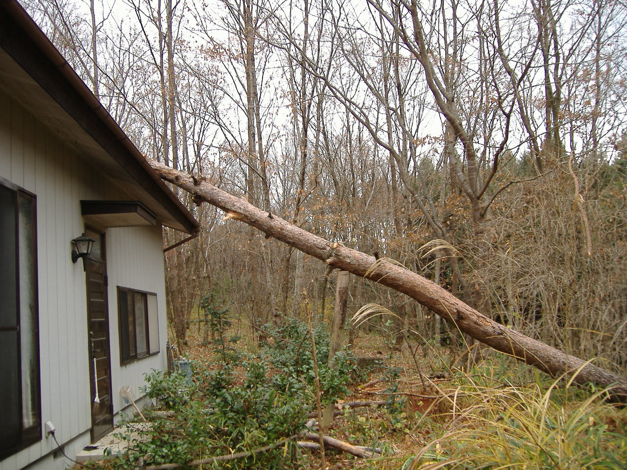 ドドーン。突然、屋根越しの頭上で大きな音と衝撃が!空から何かが落ちてきた?エーッ?ナニ?ナニ?すぐ、外に出てみました。枯れ松の倒木屋根損壊