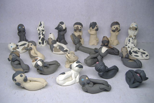犬、猫が写真やカードを口でくわえた形の陶器製で、粘土の色を活かし、黒、茶色、白色の粘土を練りこみ、ひとつひとつを手作りしたもので、型による成形で、顔料着色したものではありません。大きさは約8cmと小さく、見た目にも可愛い、ブルドック、フレンチブル、パグ、ダルメシアン、ダックスフント、ラブ、等10犬種、黒猫、三毛猫、の2猫種が現在のところ有ります。新たに仲間入りさせて行く犬も製作中です。