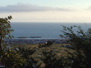 富山→小松空港→仙台空港→仙台駅→で、ようやく到着!石巻。これから2日間ステイさせていただく「門脇ハウス」に荷物を置いて、まずは裏手の日和山へ。夕暮れのキレイな時間帯で、山頂から眺める景色はとてもきれいでした。でも、沿岸部に見えるのは、瓦礫と廃車の山なのです。