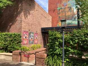 ニューヨークデリは屋外のパティオ席の壁にもミッキーのポスターがありました。