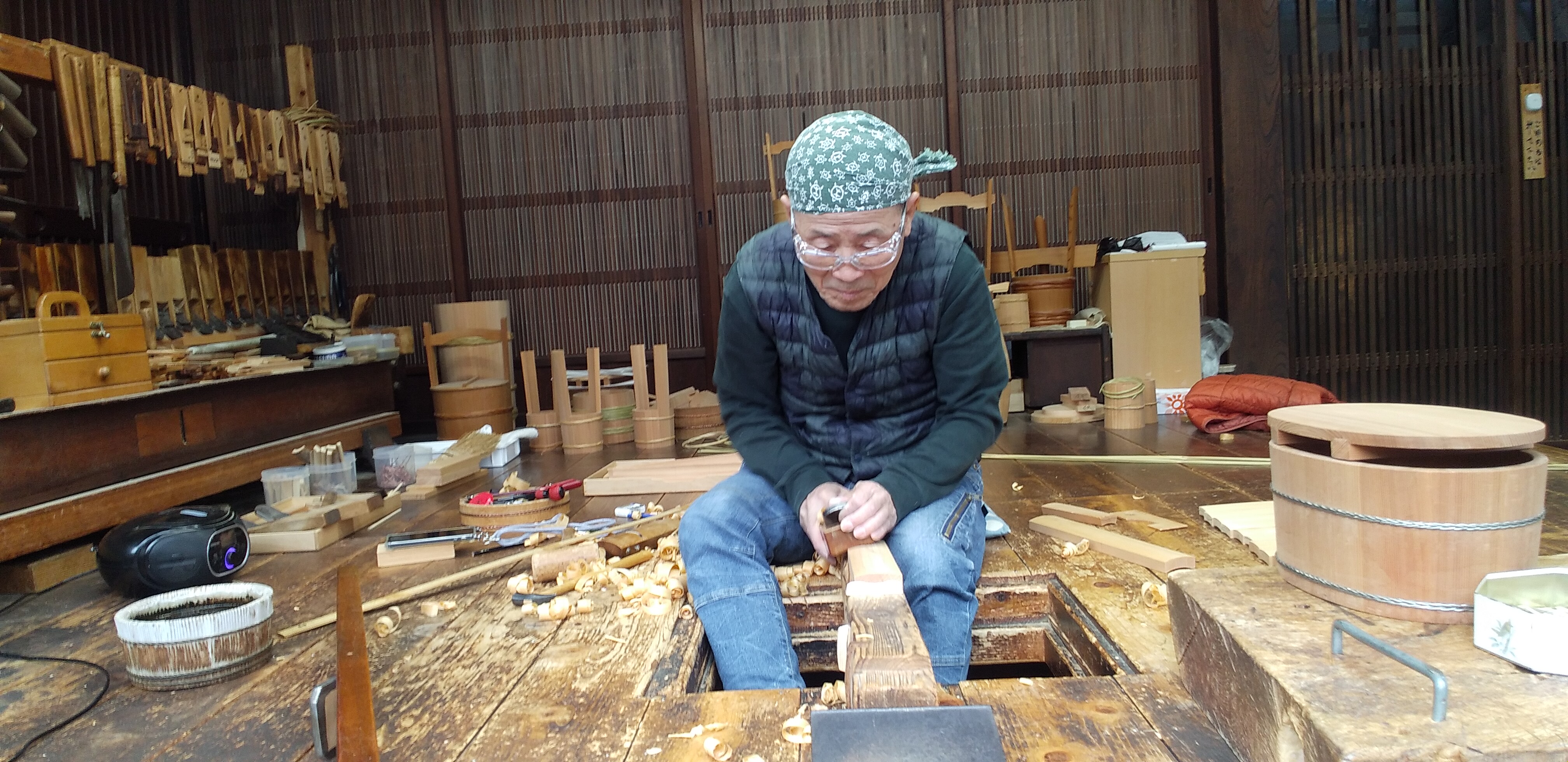 桶重、四代目にカンナで削ってもらうポーズをとってもらいました