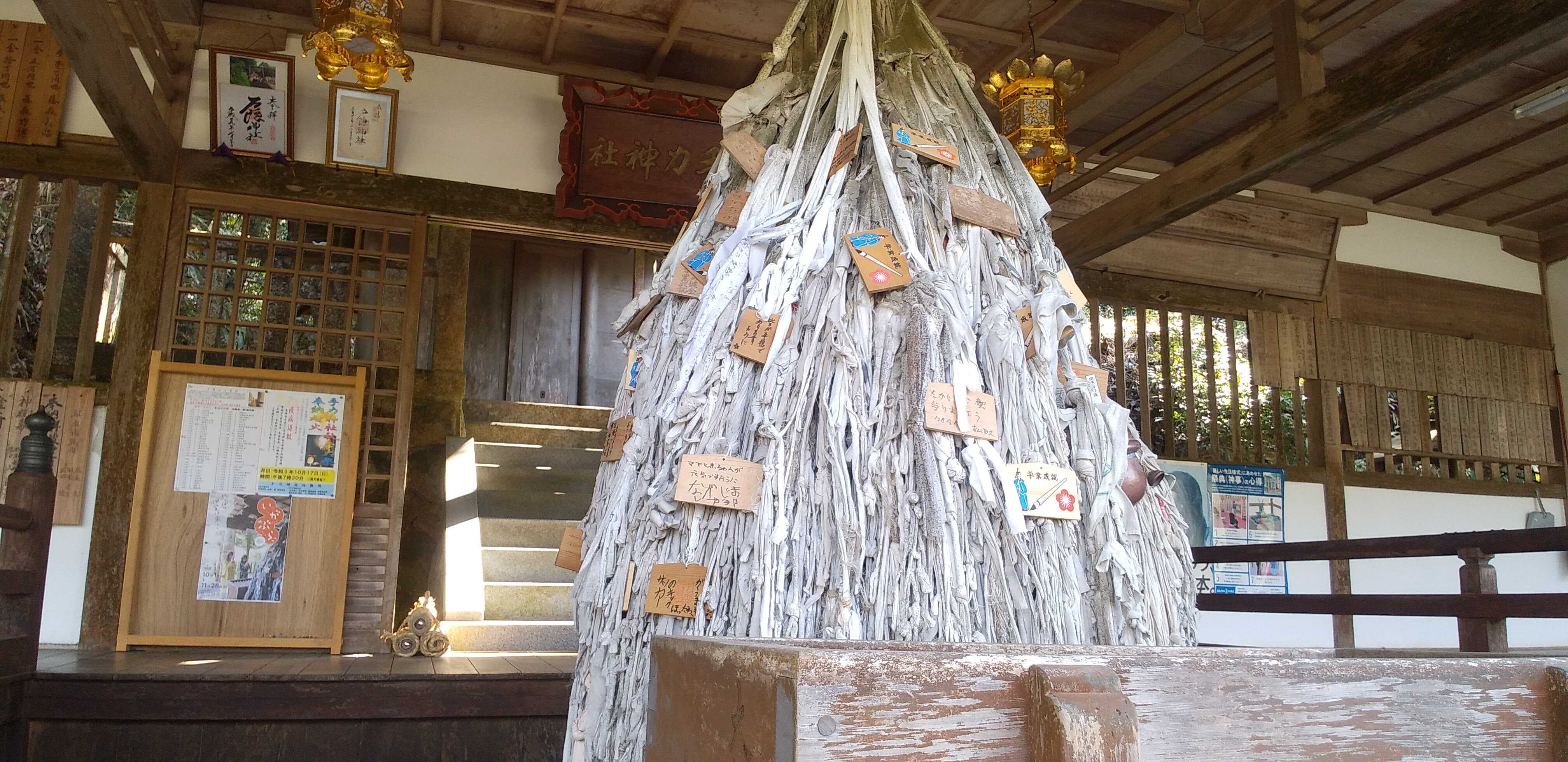 拝殿の中央に進むとそこには、昔から今日に至るまでの数十万人に及ぶ祈りの鐘の緒がさがり奉納者の願いが神に通じています。