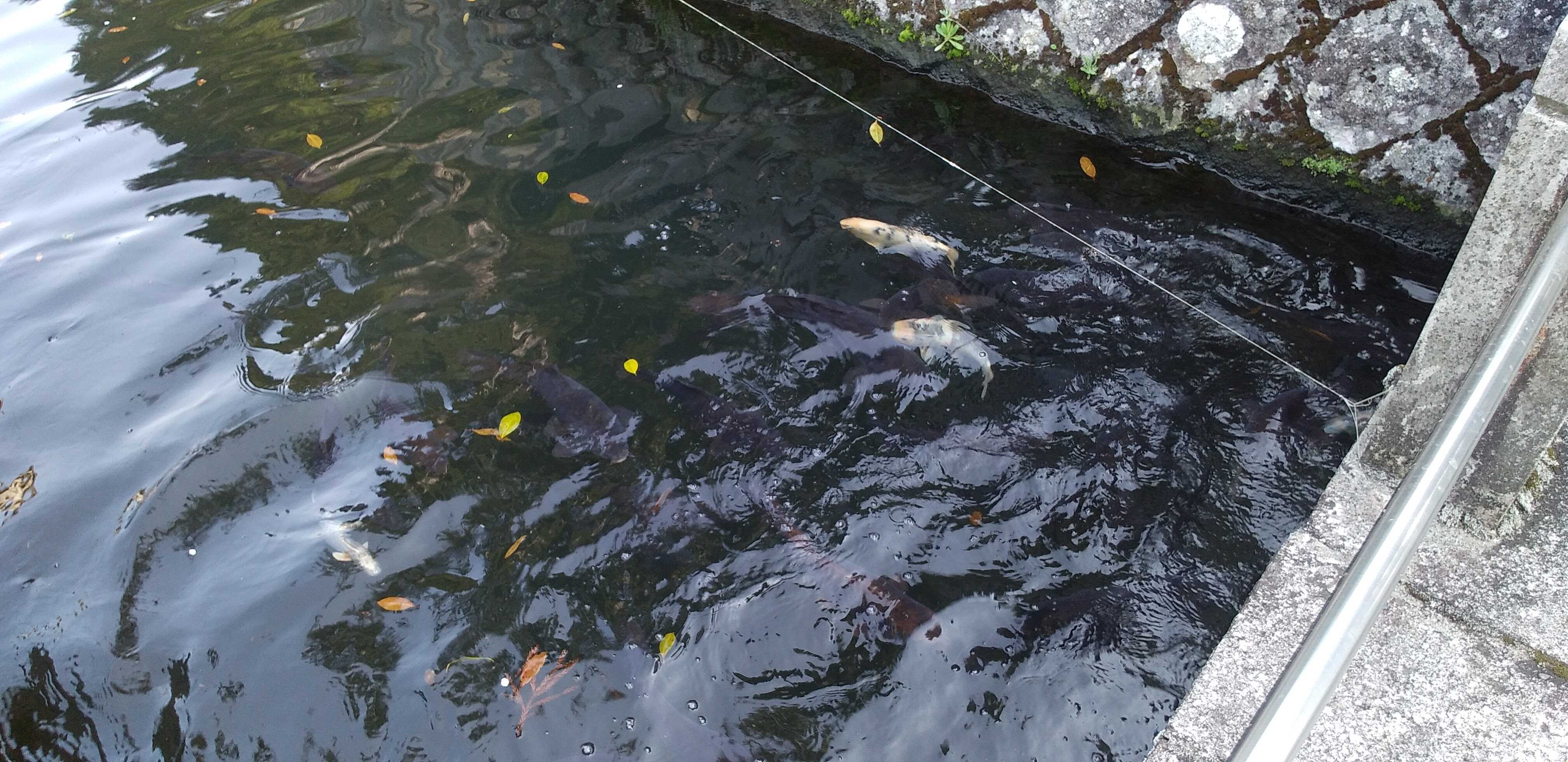 神苑奥にに樹々があり古墳の形態を呈しています。境内正面左右に掘を巡らし錦鯉が泳ぎ、