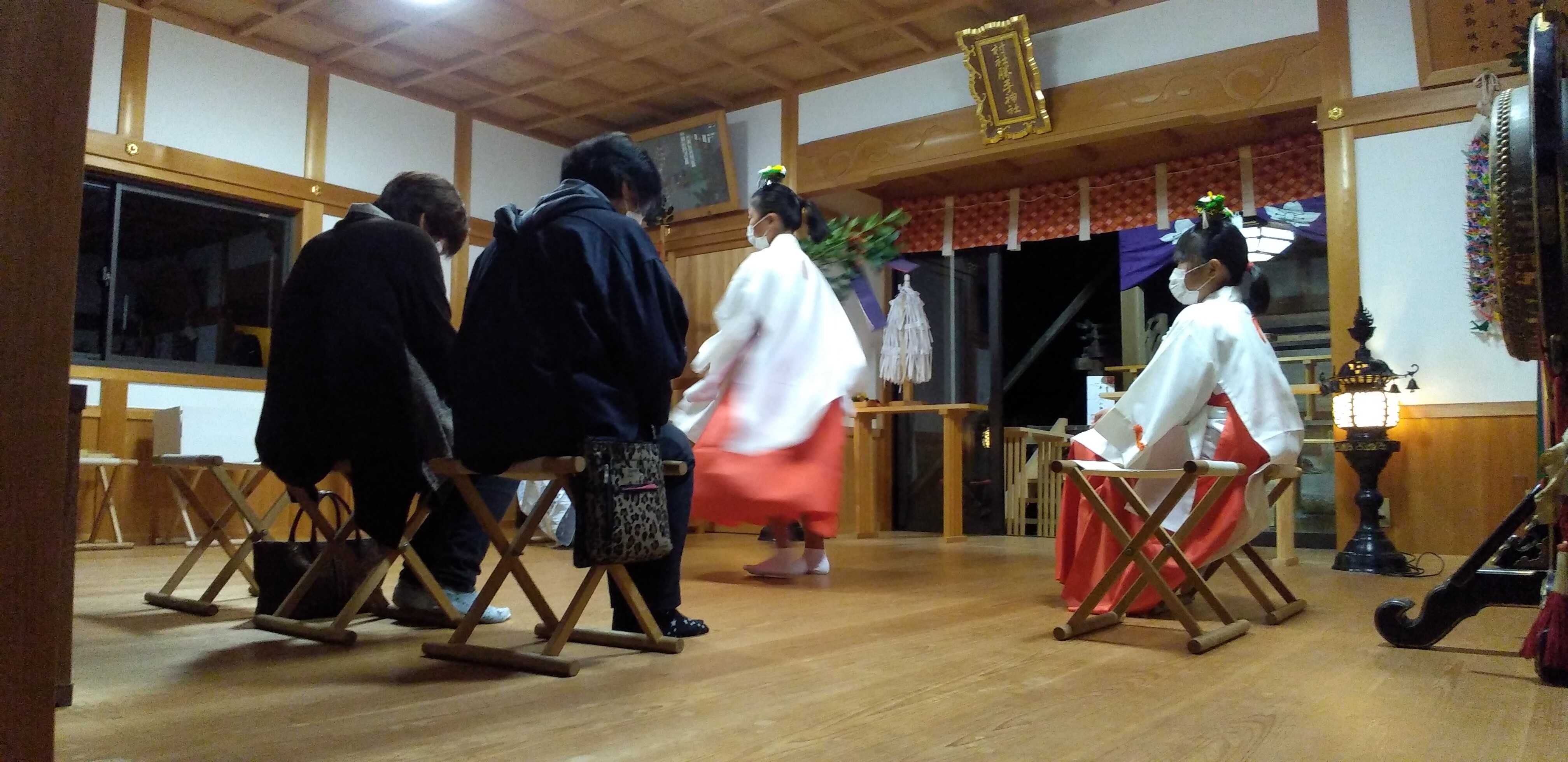 村社勝手神社の額が掲げられている祭殿では笛太鼓が加わる宮司さん、巫女さんの舞による家内安全、無病息災などの御祓いが行われていました。