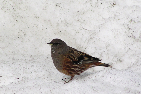 今日はあまり野鳥のことを考えずに(いや!)仕事できました。お城(大阪城)のシーズンももうおわりかな?とか、今週末どこ挑戦しよう?かな。とか色々考えているうち、なんと一日が過ぎてしましました。(いつ仕事してる??^_^;)今日はやはり昨年の今頃まで撮置きの、高山の野鳥シリーズとして「イワヒバリ」をアップすることにしました。穂高の5月は、雪が5m以上も積もった冬山に近い状況ですが、過酷な環境で雪虫?を盛んに追っかけていました。ちなみに、イワヒバリは2~3千mの森林限界近くで人を恐れず、山荘前では何か欲しそうにキュルキュルピリピリッと鳴いて足元まで近づいてきます。とってもかわいいですよ!!また、最近のNHK「ダーウインが来た。」で紹介され、♀が♂にプロポーズするという変わった習性で、知名度がアップした野鳥でもあります。<奥穂高でのイワヒバリ>H16.5.15 奥穂高 posted by (C)328手持ちのまっちゃんH15.5.4 奥穂高 posted by (C)328手持ちのまっちゃん<木曾駒でのイワヒバリ>H15.10.6 木曽駒ケ岳(2) posted by (C)328手持ちのまっちゃんH15.10.6 木曽駒ケ岳(1) posted by (C)328手持ちのまっちゃん<焼岳でのイワヒバリ>H20.10.20 焼岳(2) posted by (C)328手持ちのまっちゃんH20.10.20 焼岳(1) posted by (C)328手持ちのまっちゃん