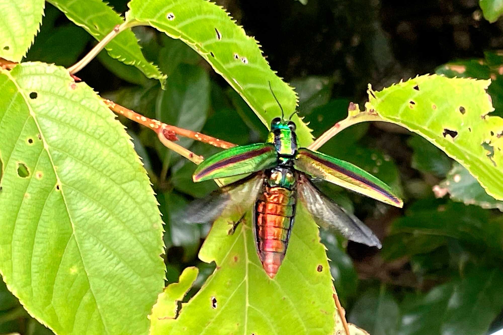 ☆大阪南方面のお山で近くの葉に留ってくれた「タマムシ」