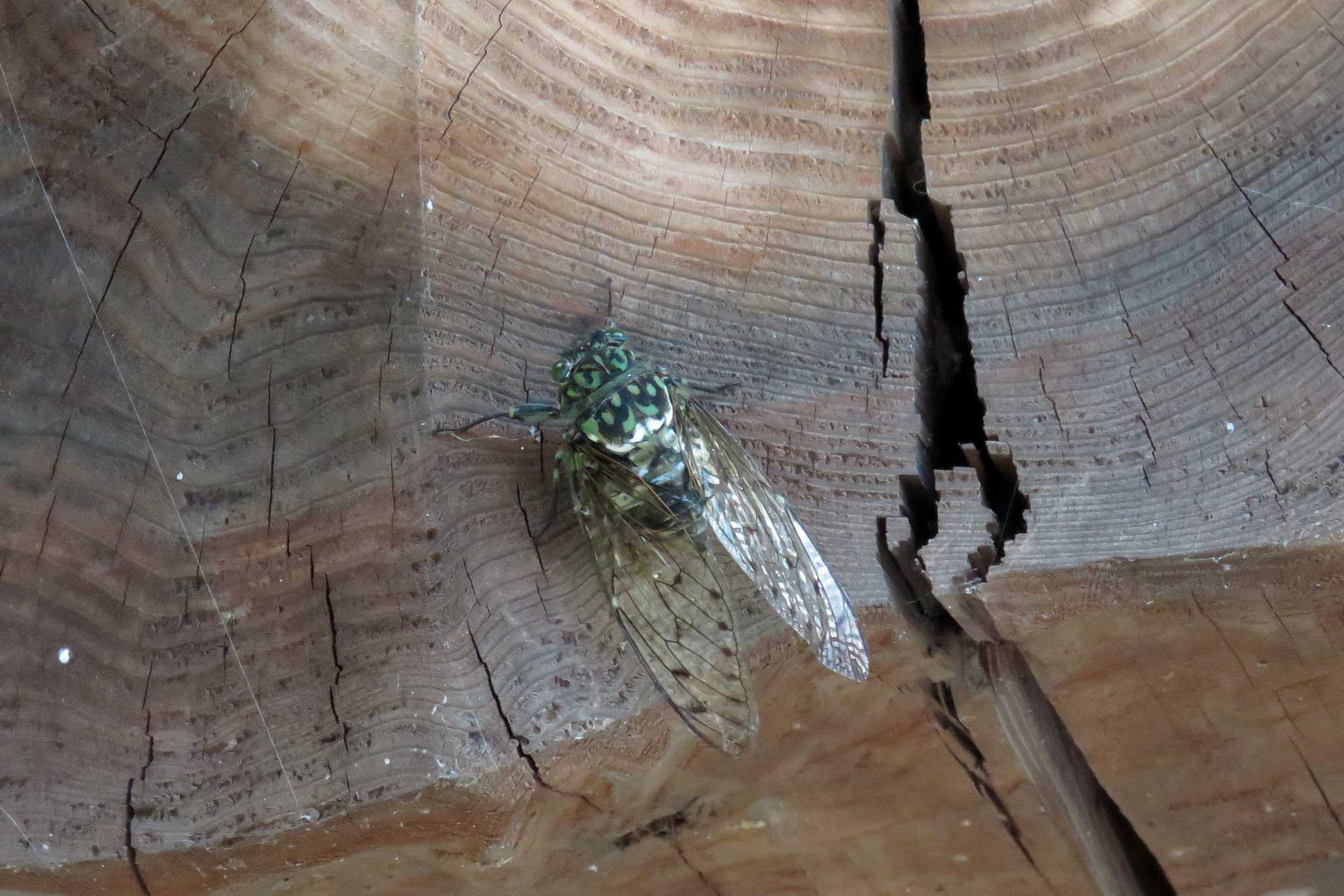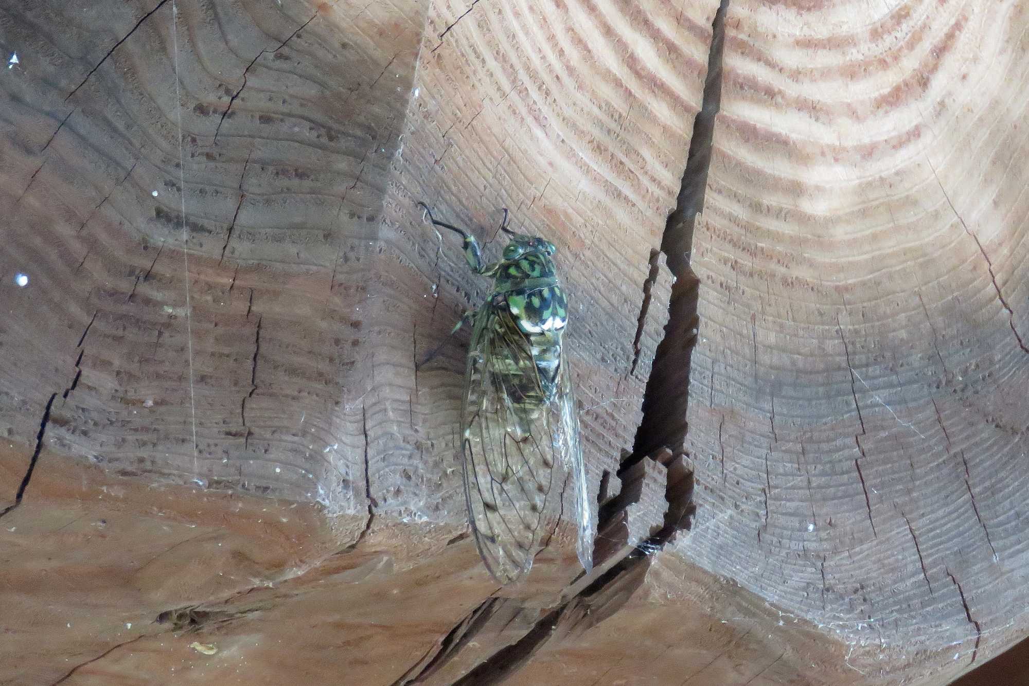 ☆岩湧の森で目の前の柱に留って鳴き始めた「ツクツクボウシ」と「ミンミンゼミ」
