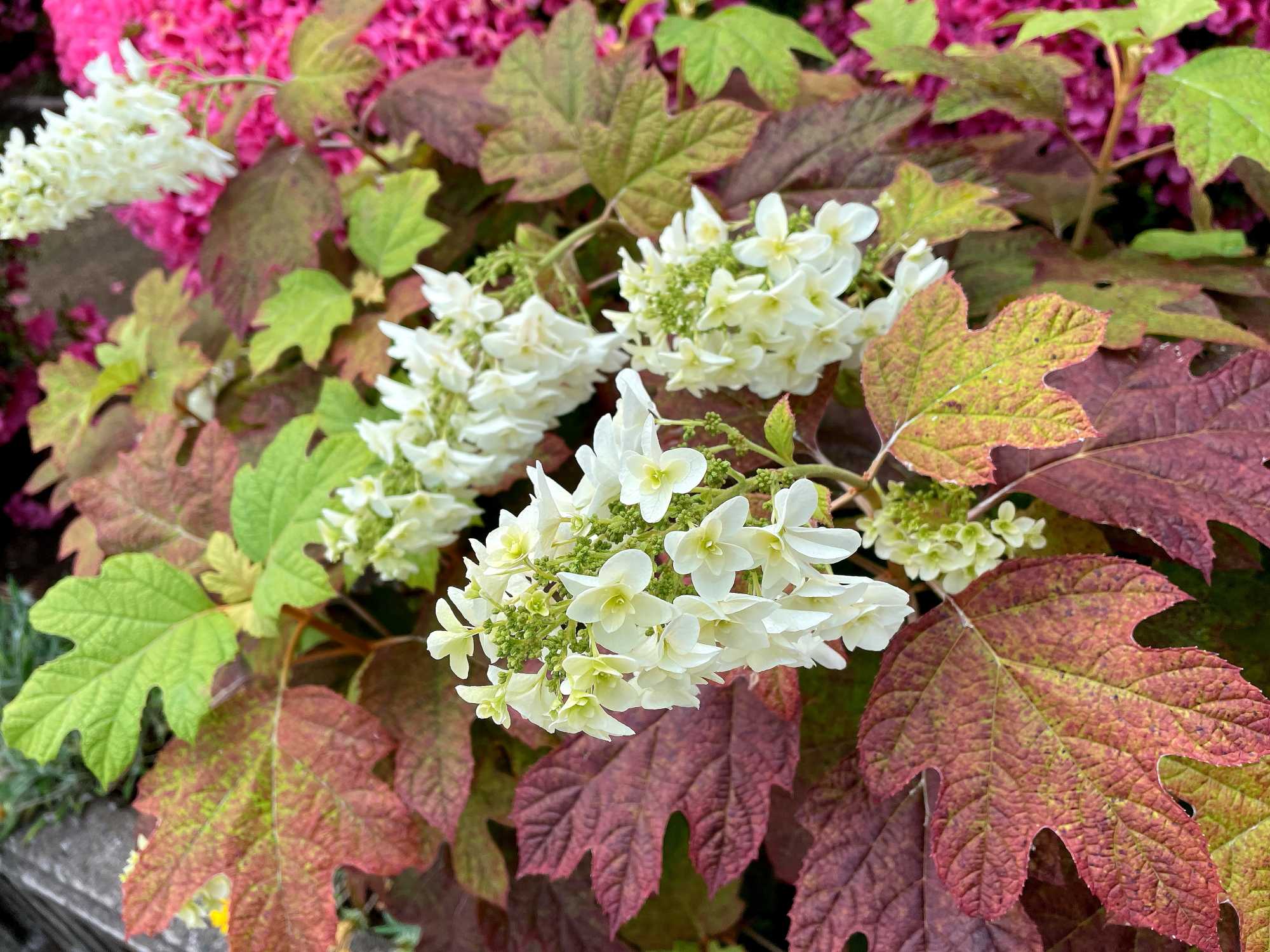 カシワバアジサイは、大きな円錐形の花房が特徴で、花の名前は切れ込みの入った葉の形が、落葉樹のカシワ(柏)の葉に似ているところから名付けられました。
