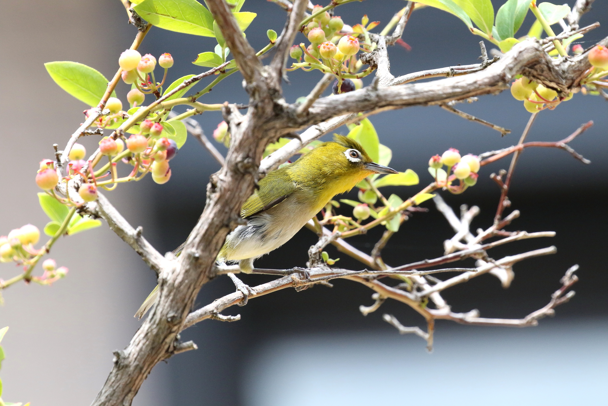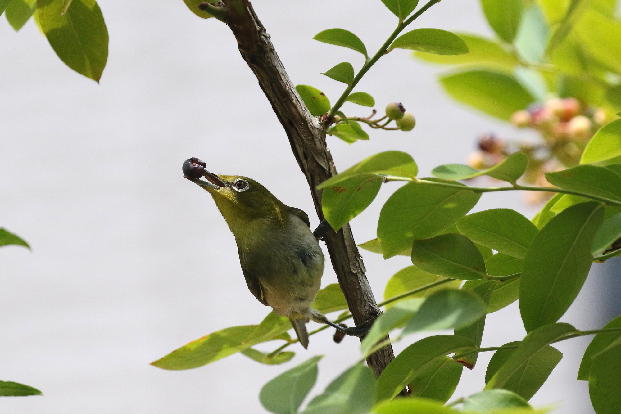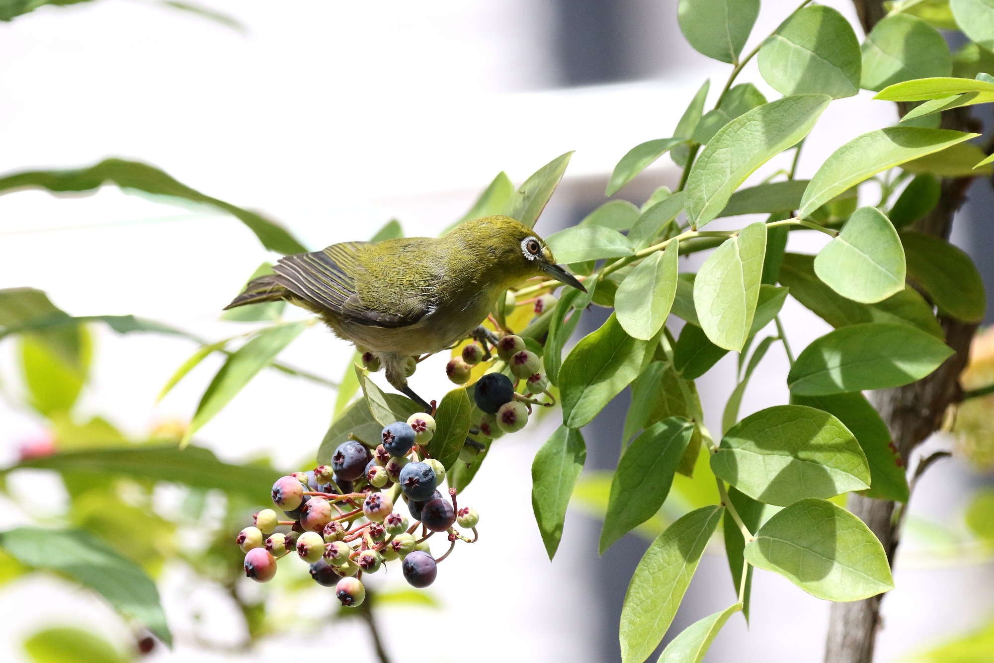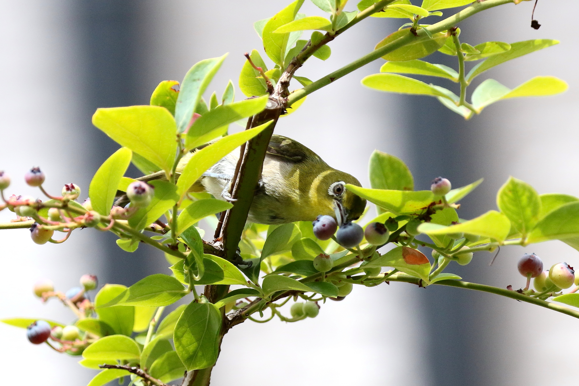 ☆我が家との境界に植えられたお隣のブルーベリーの実の採餌にやってきた「メジロ」