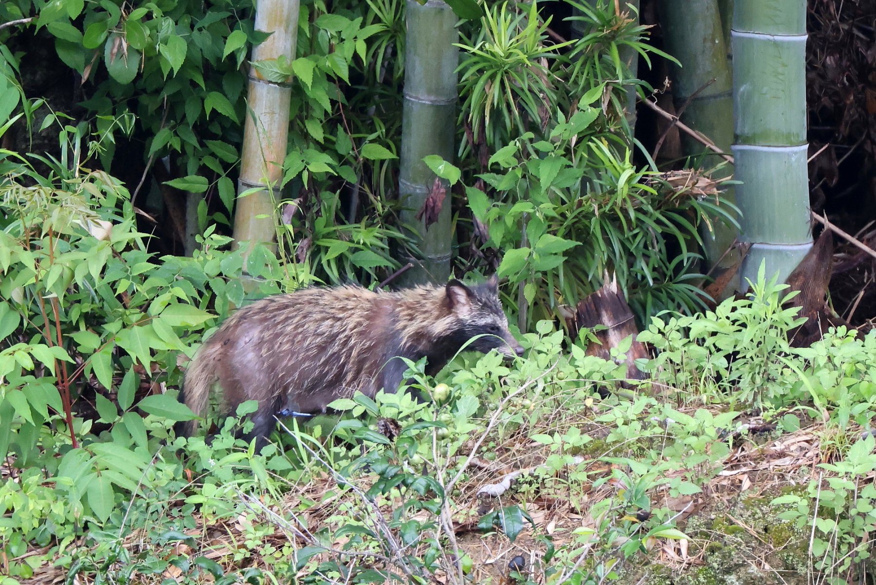 和泉市コミュニティファーム付近の田圃の畦道に、突然の雨でずぶ濡れになった「タヌキ」が現れ、畦道を通って竹藪の中に消えていきました(^-^)