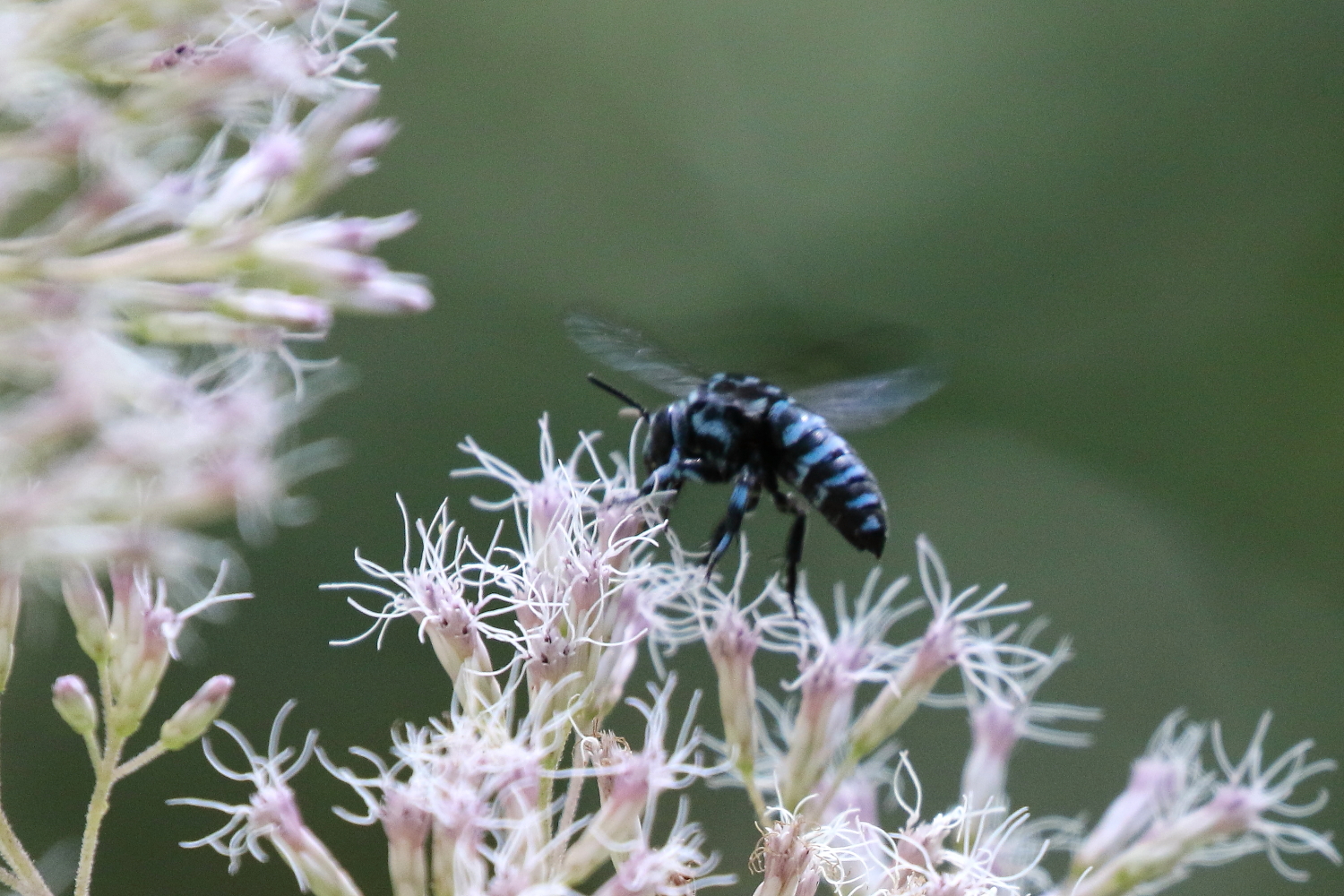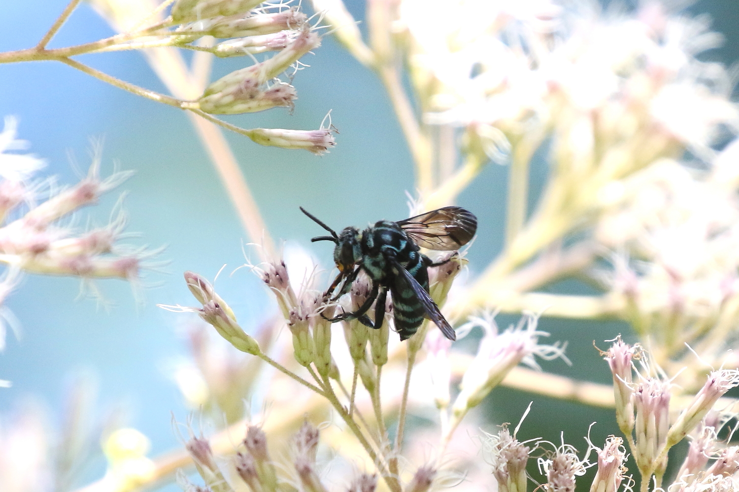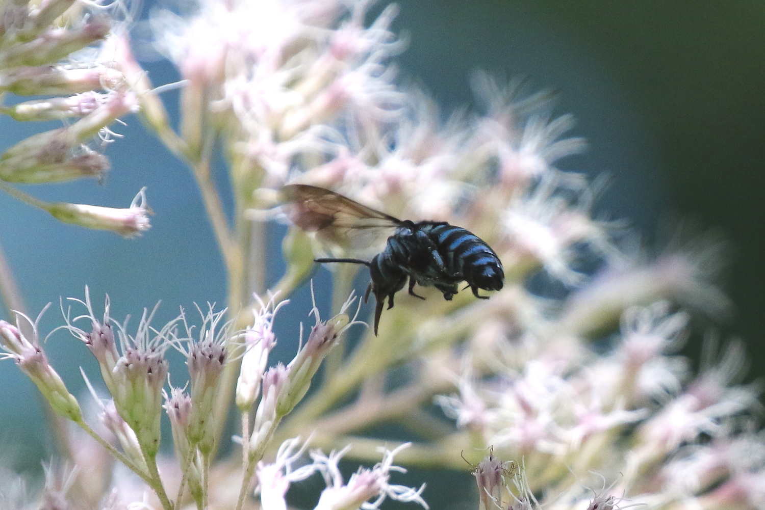 河内長野市の府営公園で、先日ブルービーこと「ルリモンハナバチ」が、ヒヨドリバナ類(ユーパトリウム・プルプレウム)の花の吸蜜に、3匹も飛び交っていた時のふうさんバージョンです(^-^)