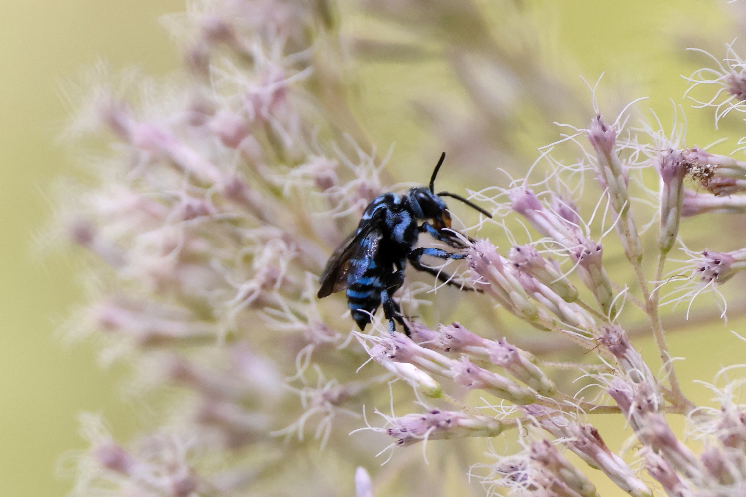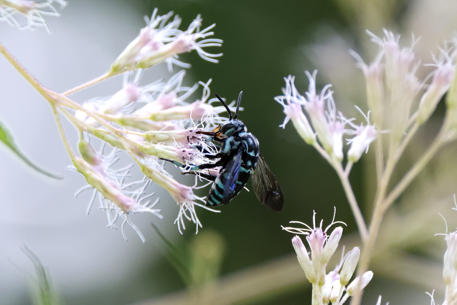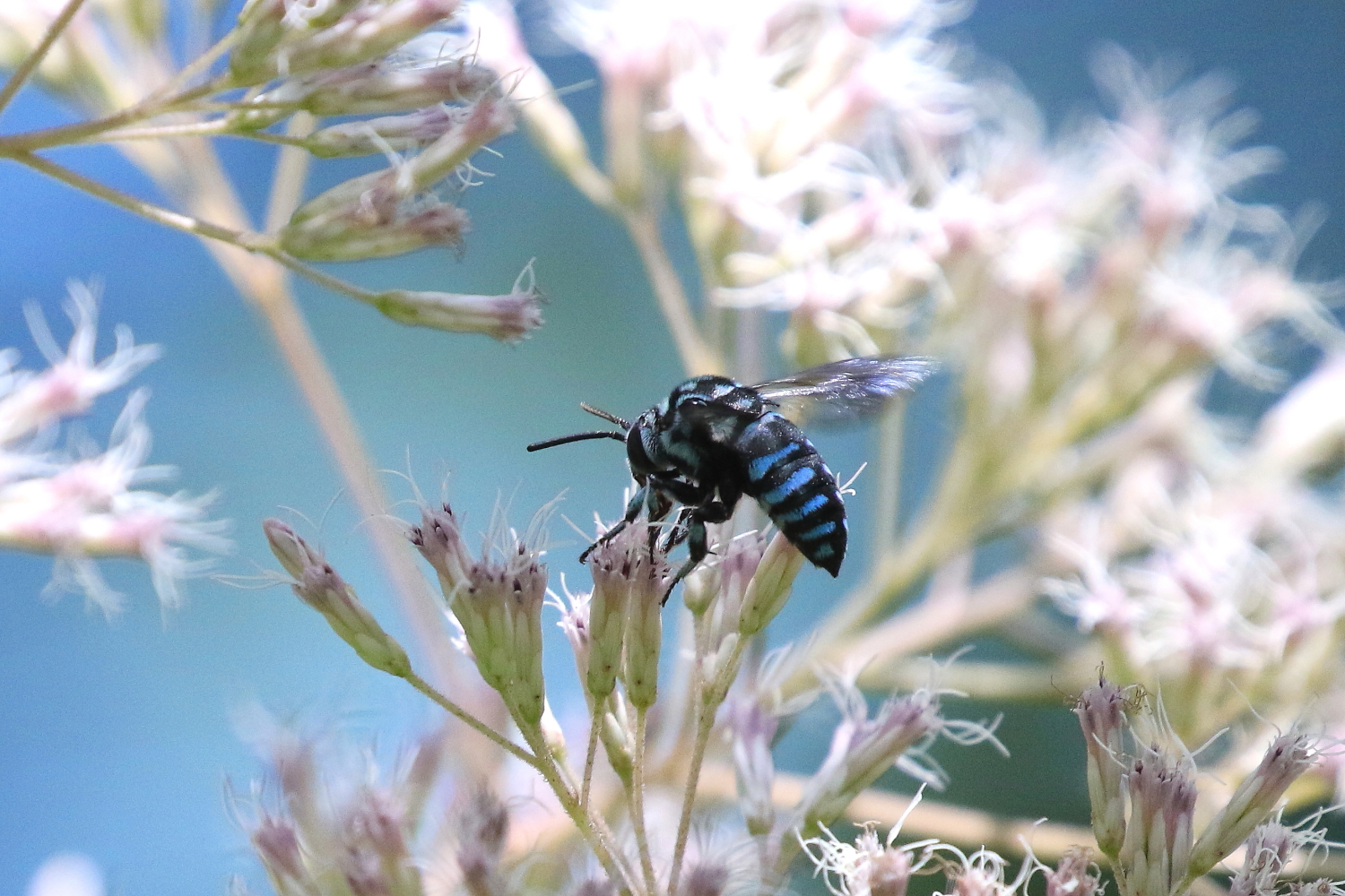(本日更新2)河内長野市の府営公園で、先日ブルービーこと「ルリモンハナバチ」が、ヒヨドリバナ類(ユーパトリウム・プルプレウム)の花の吸蜜に、3匹も飛び交っていた時にたくさん撮れたので、今日はその続編です(^-^)