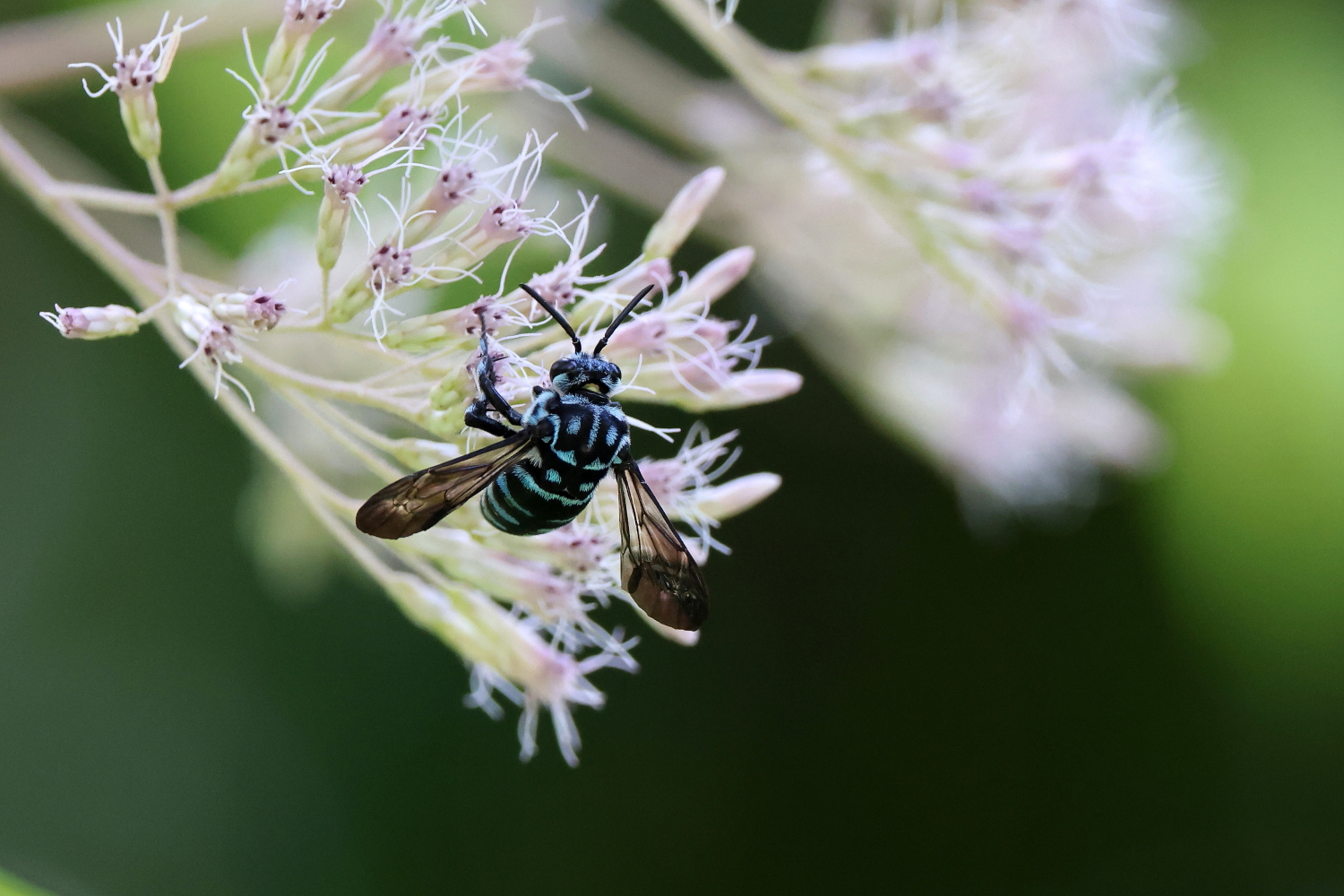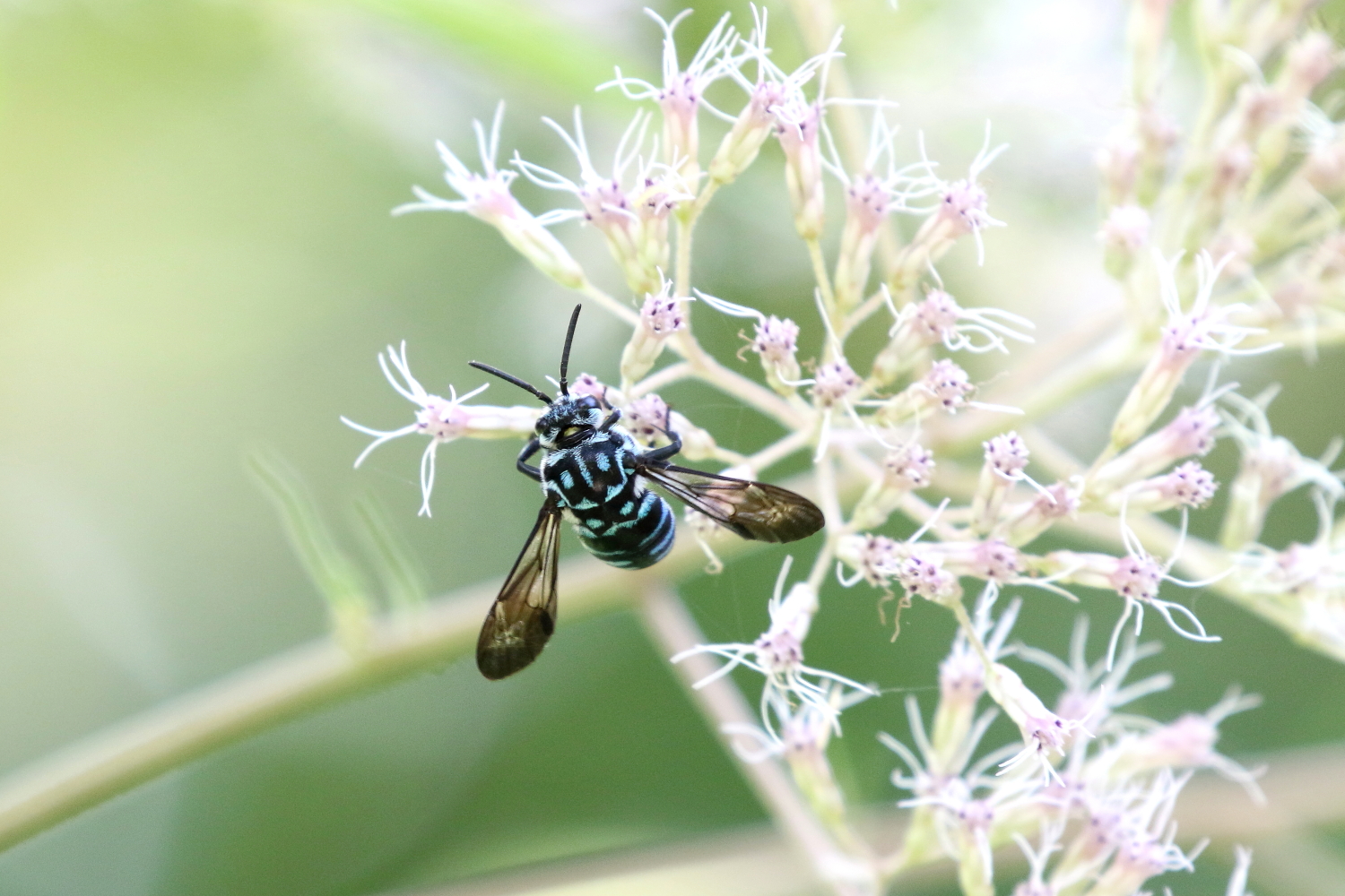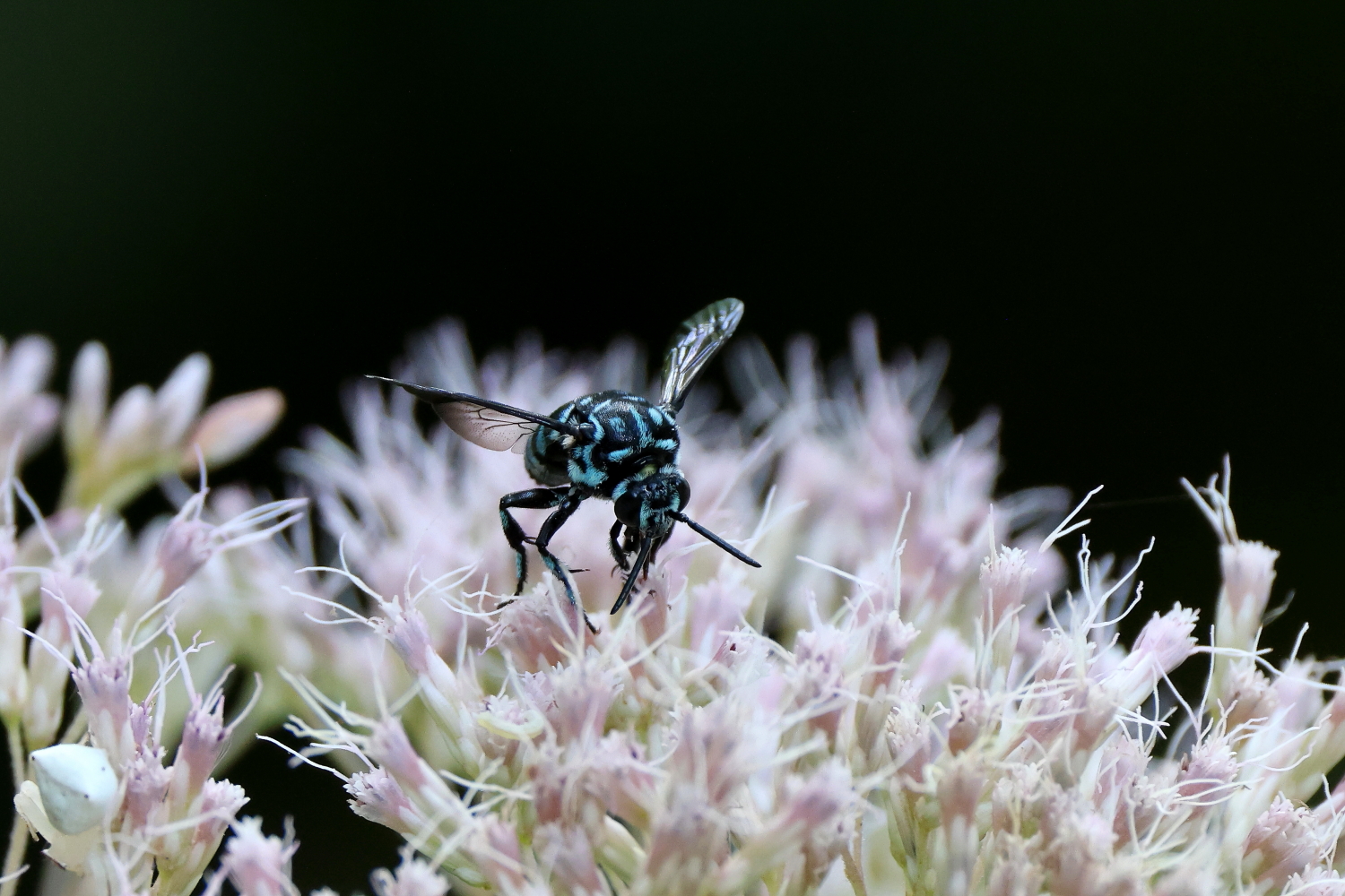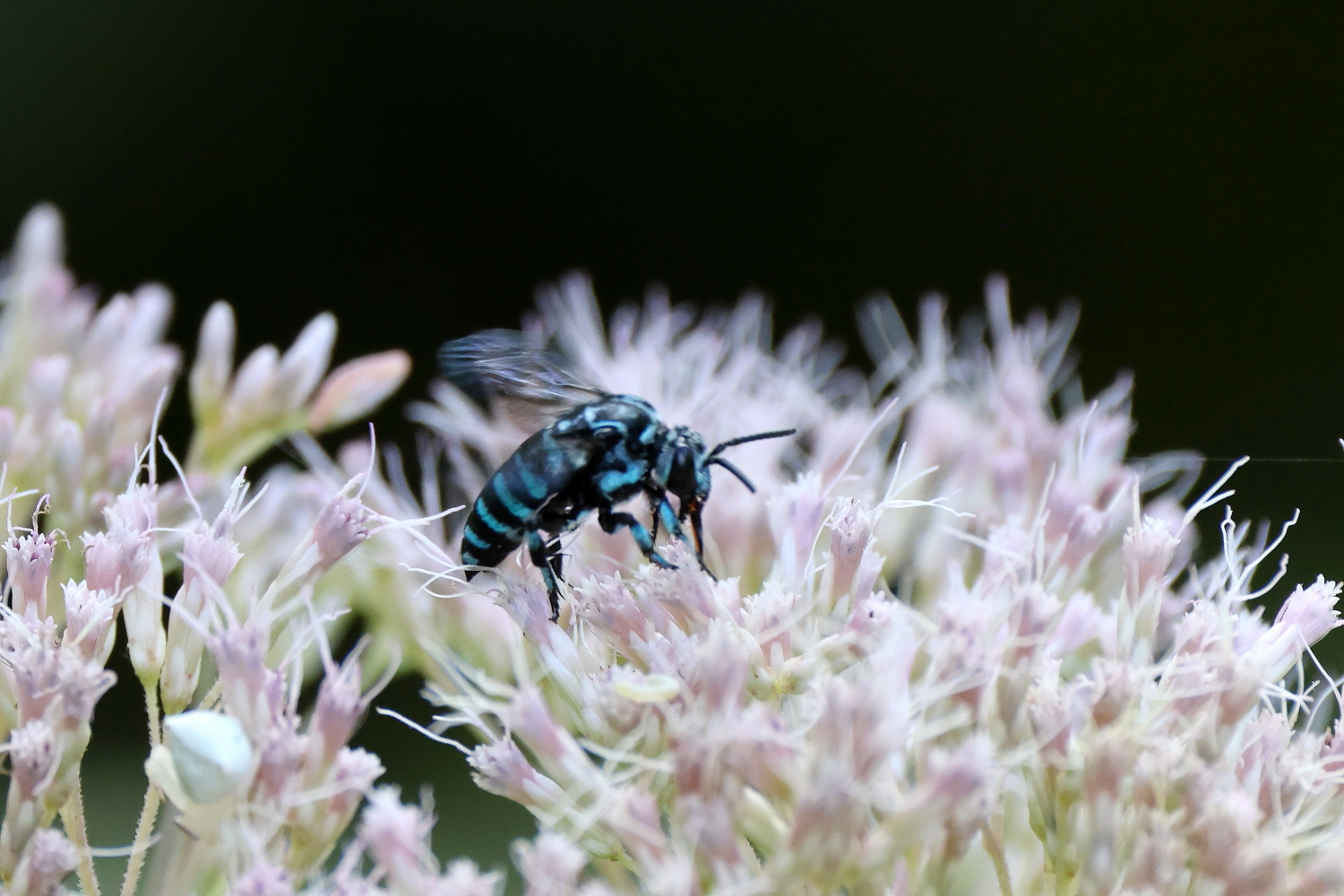 (本日更新2)河内長野市の府営公園で、先日ブルービーこと「ルリモンハナバチ」が、ヒヨドリバナ類(ユーパトリウム・プルプレウム)の花の吸蜜に、3匹も飛び交っていた時にたくさん撮れたので、今日はその続編です(^-^)