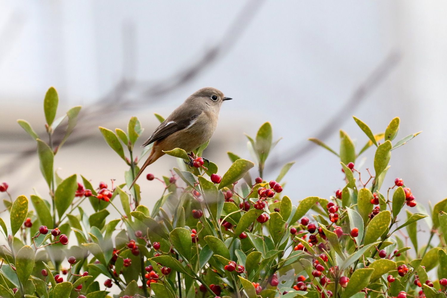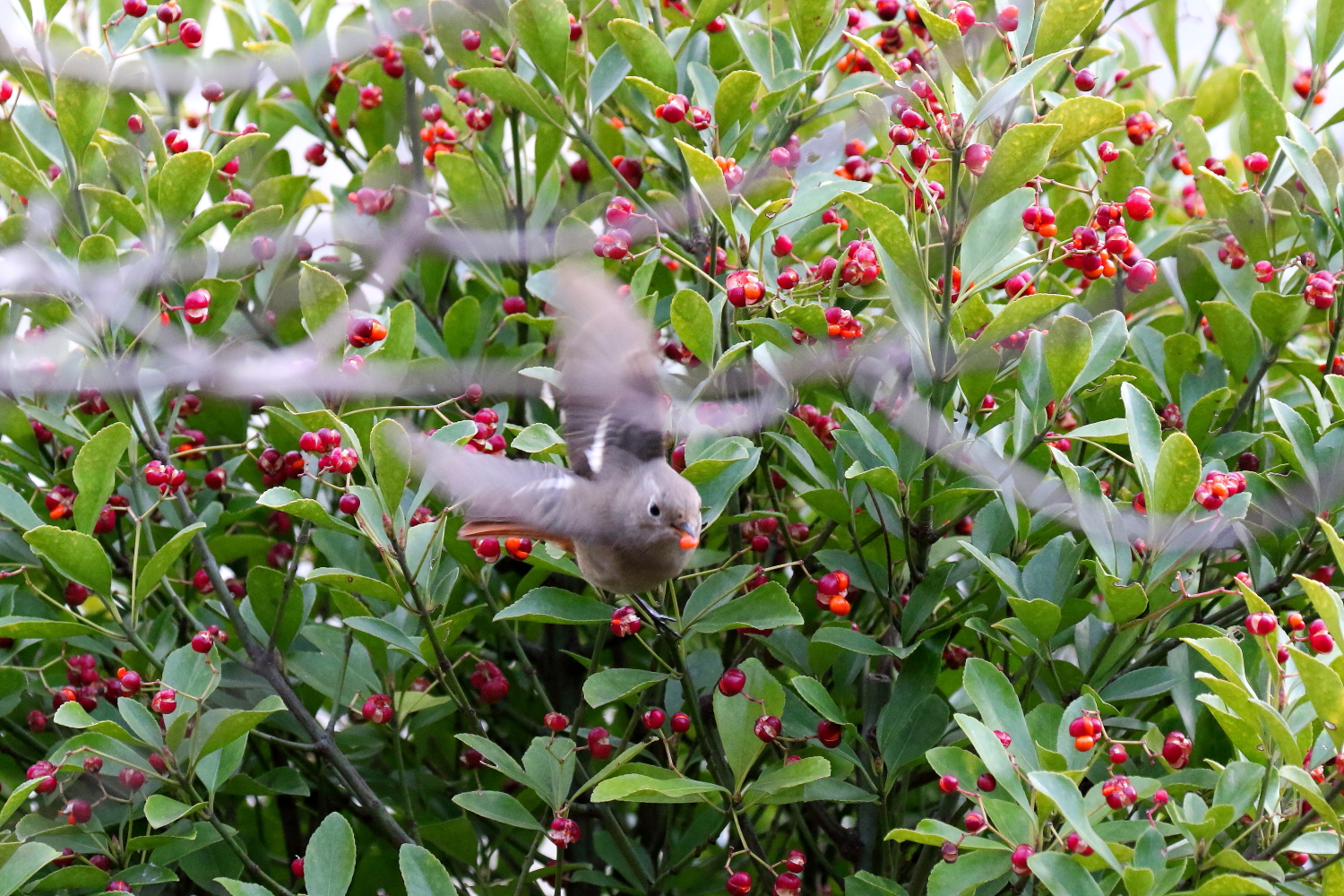 今回は、マサキの樹の上の方でジョウビタキ♀が実を採餌していたので、下の方が見えなかったようで、うまく♂が同じ樹の下の方で実を採餌していました^^