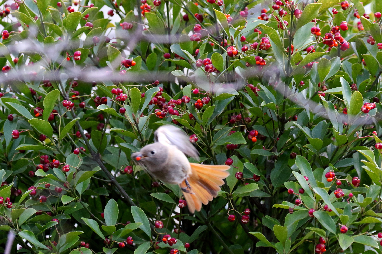 ☆お庭のマサキの樹に突然現れた「よそ者のジョウビタキ♂」と「縄張り♀」