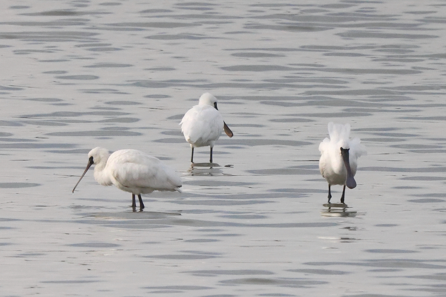 (本日更新2)岸和田の大池で撮影していた超珍鳥「クロツラヘラサギの相互羽づくろい」で、2羽で仲良く羽繕いをしあっていましたが、ヘラサギが割り込んできました(^-^)