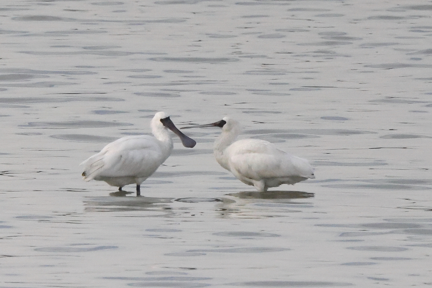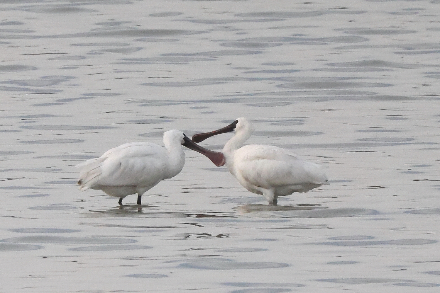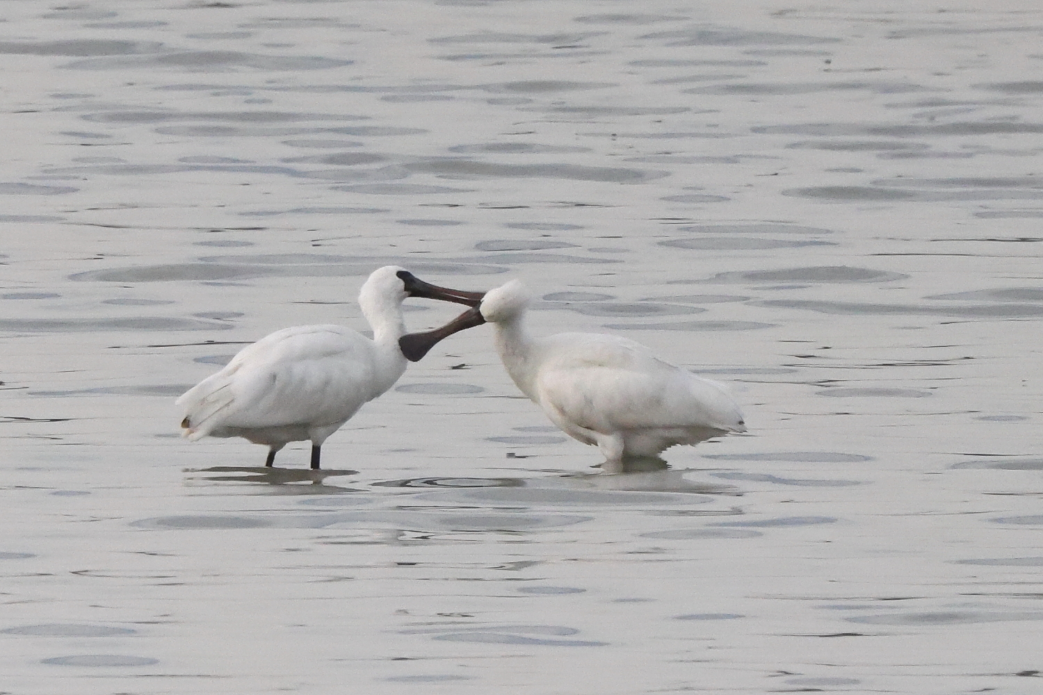 ☆岸和田の大池で撮影していた超珍鳥「クロツラヘラサギの相互羽づくろい」
