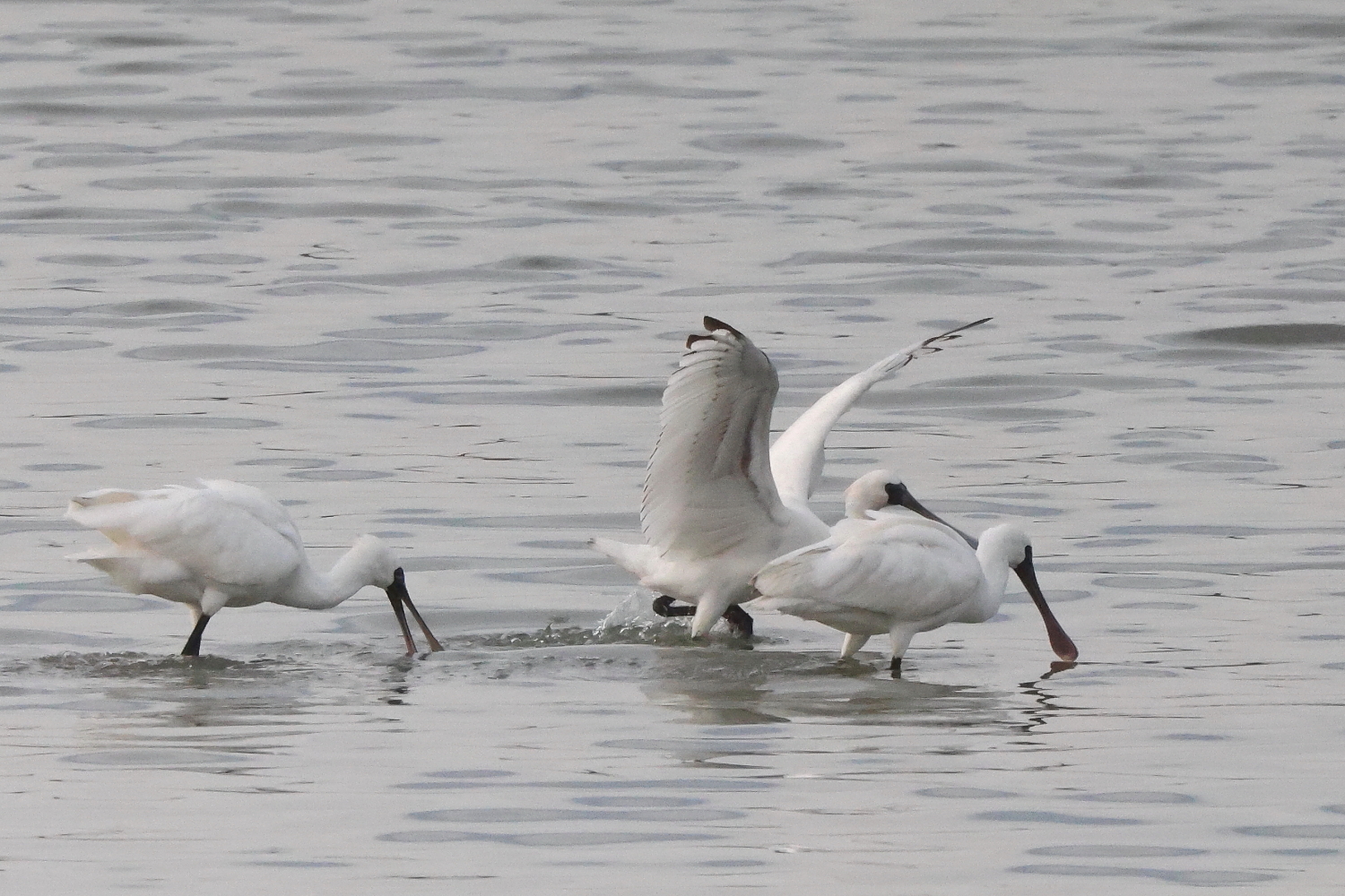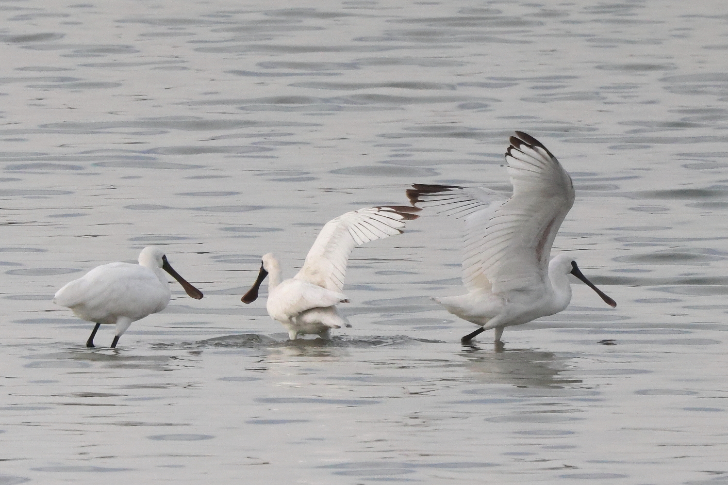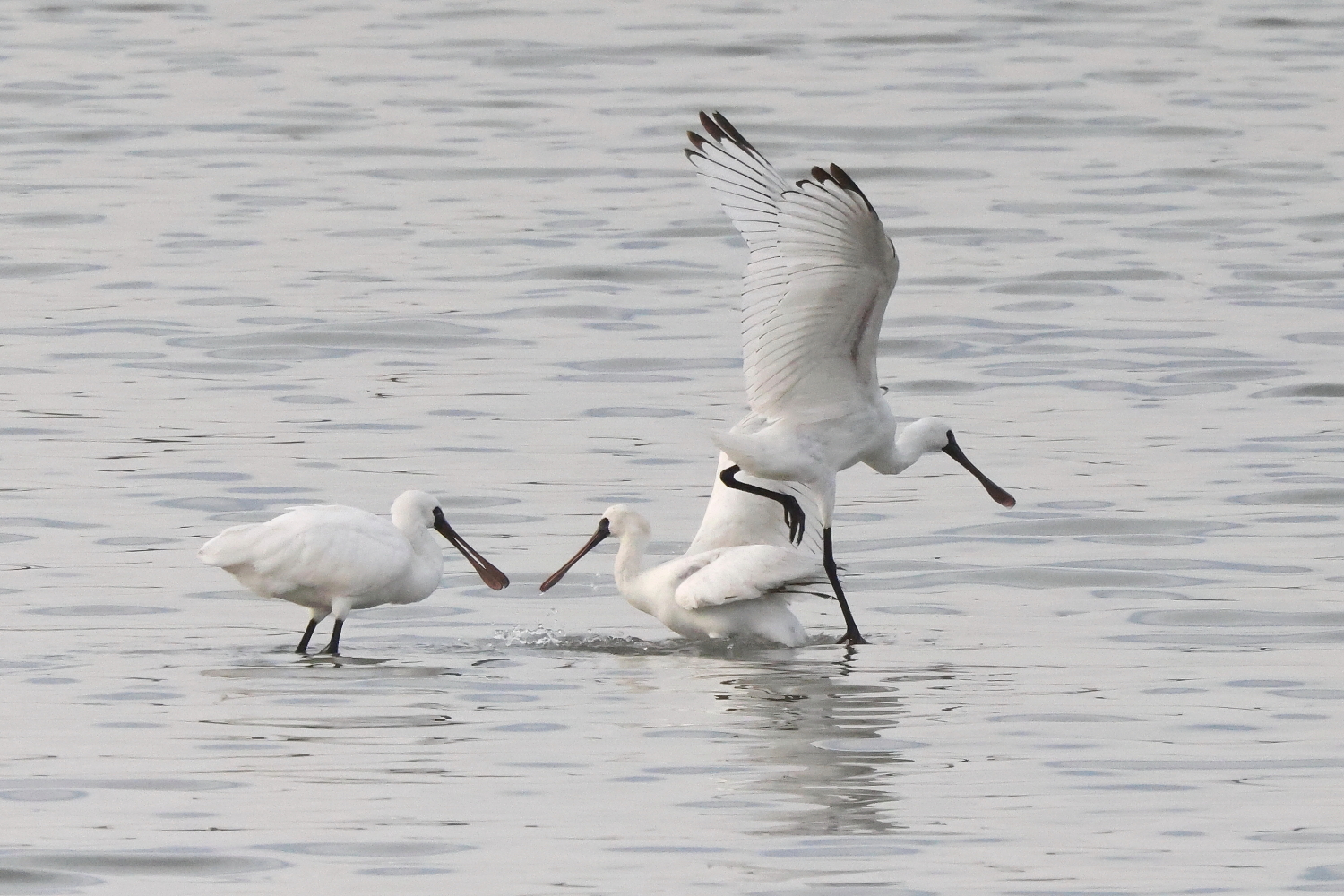 ☆岸和田の大池で撮影していた超珍鳥「クロツラヘラサギの相互羽づくろい」