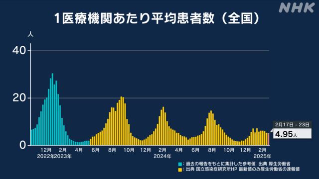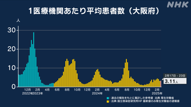 地元大阪府で、先週1週間(2月17日〜2月23日)に報告された新型コロナウイルスの定点医療機関あたりの患者数は、全国的にもほぼ横這い傾向になりました。