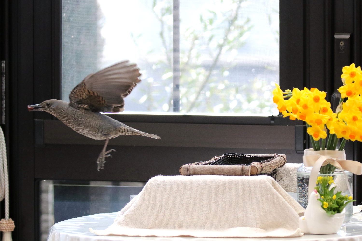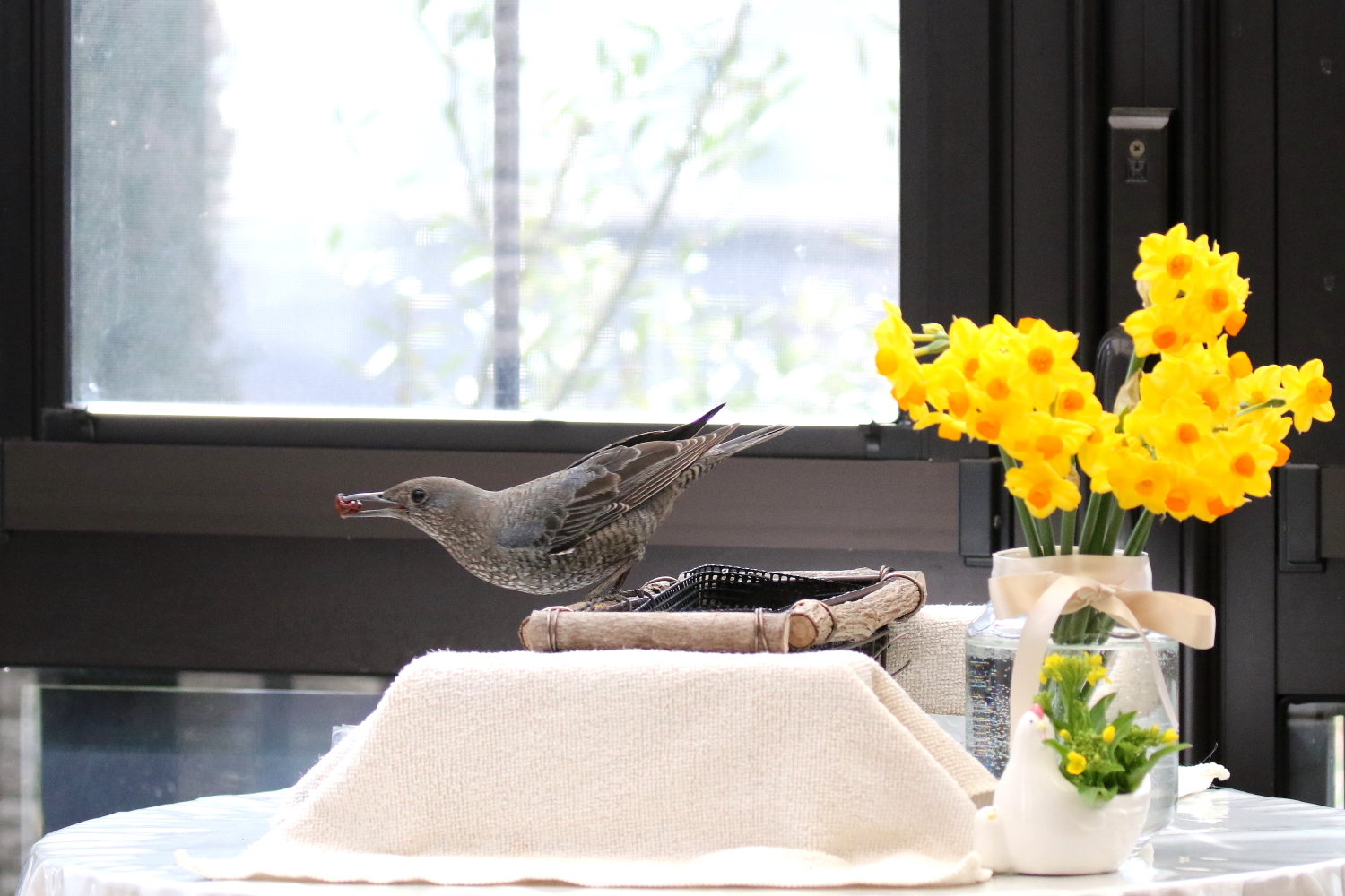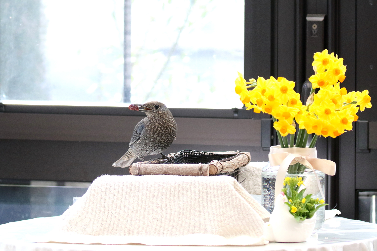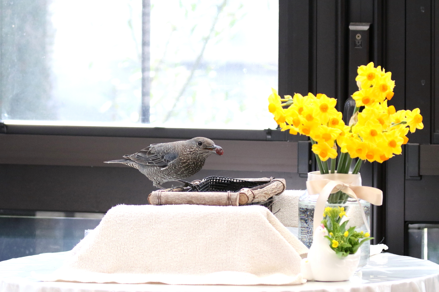 (本日更新2)イソヒヨドリに恋の季節がやってきていますが、いつもサンルームにやって来る常連の♂に加えて、このところは「イソヒヨドリ♀」もサンルームにやって来るようになったので、お庭で満開に咲き誇っていた「キズイセン」を切り花にして飾ってやりました(^-^)