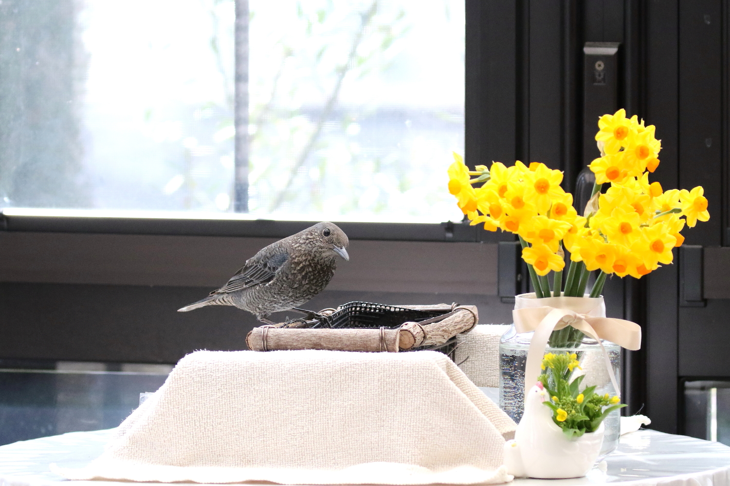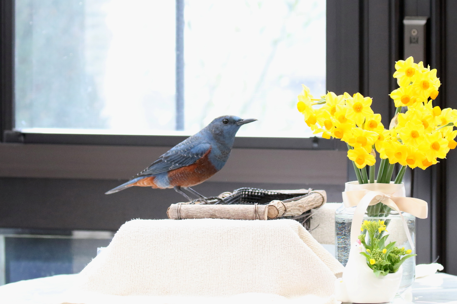 なので室内撮影となり、お庭で満開に咲き誇っていた「キズイセンの花」を、切り花にしてサンルームのエサ台横に飾っておくと、常連の「イソヒヨドリ♂」に続いて「イソヒヨドリ♀」も採餌にやって来ました(^-^)