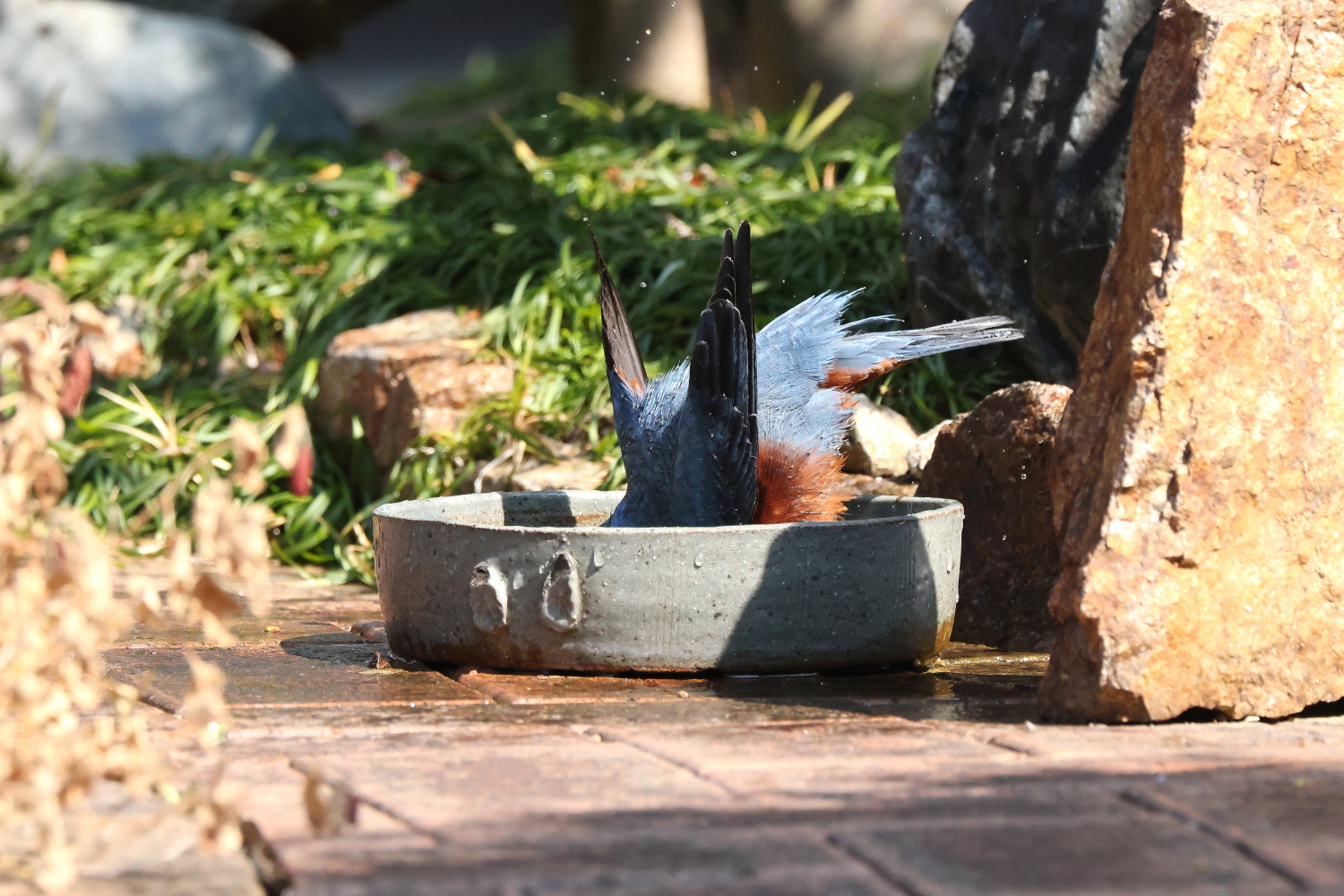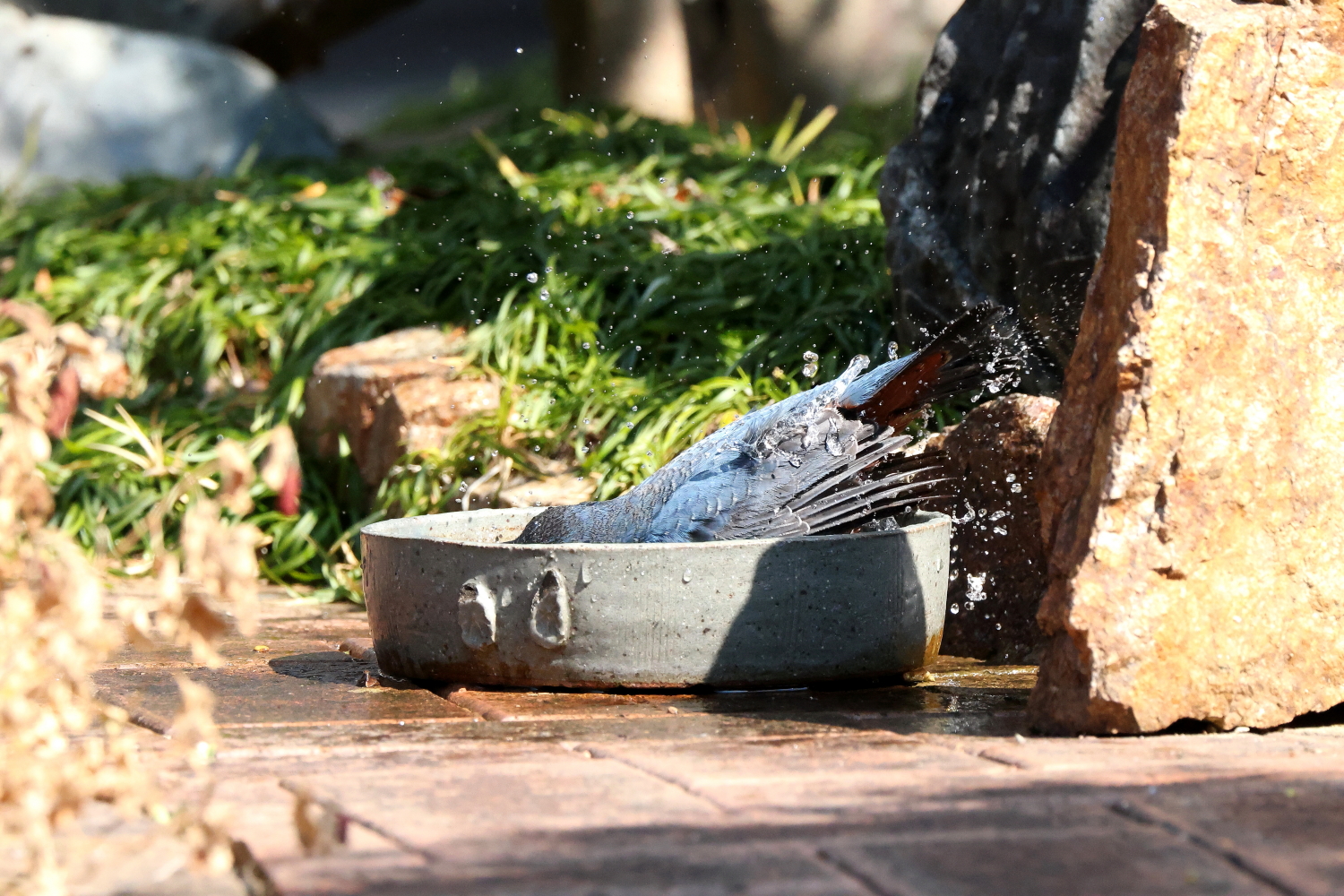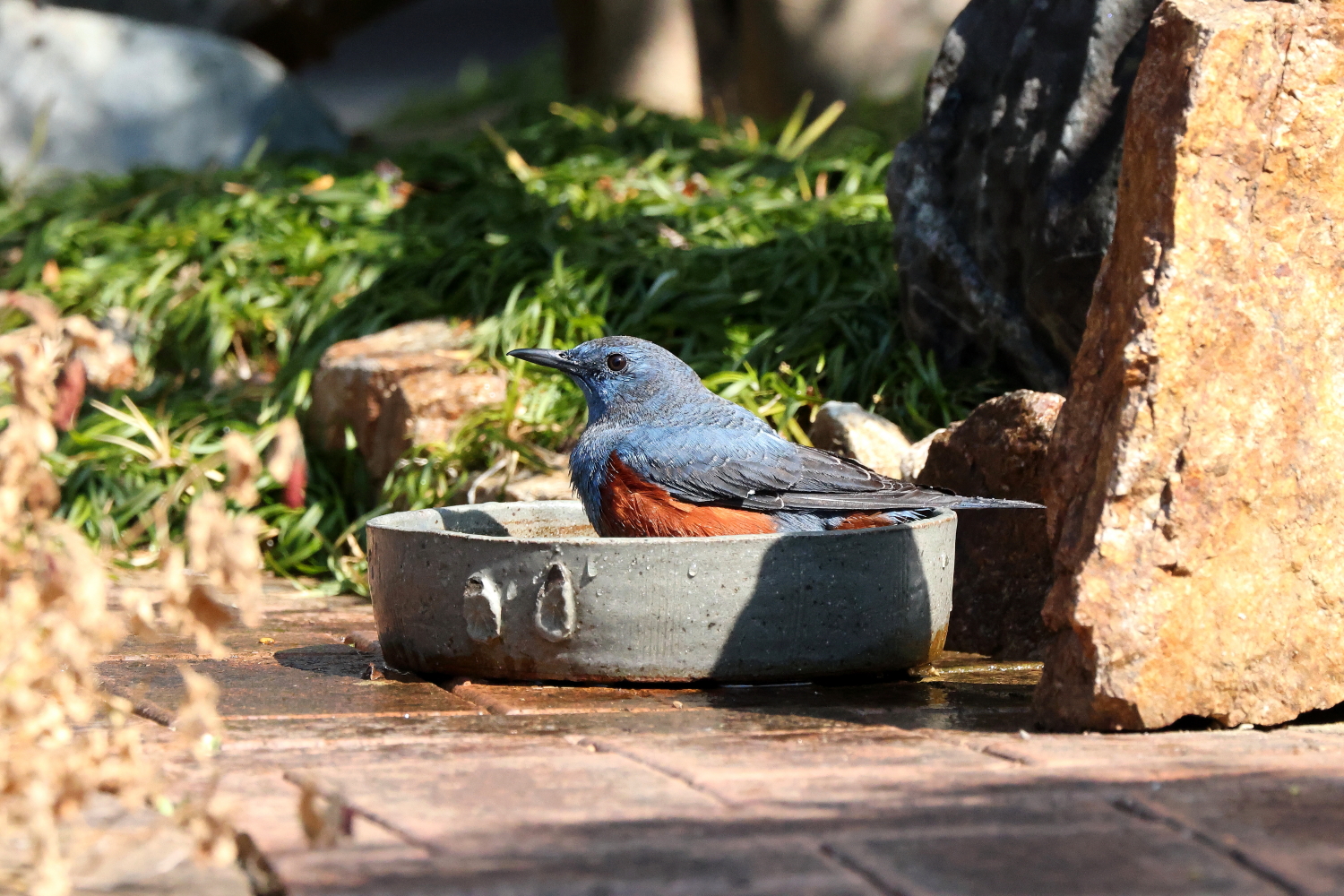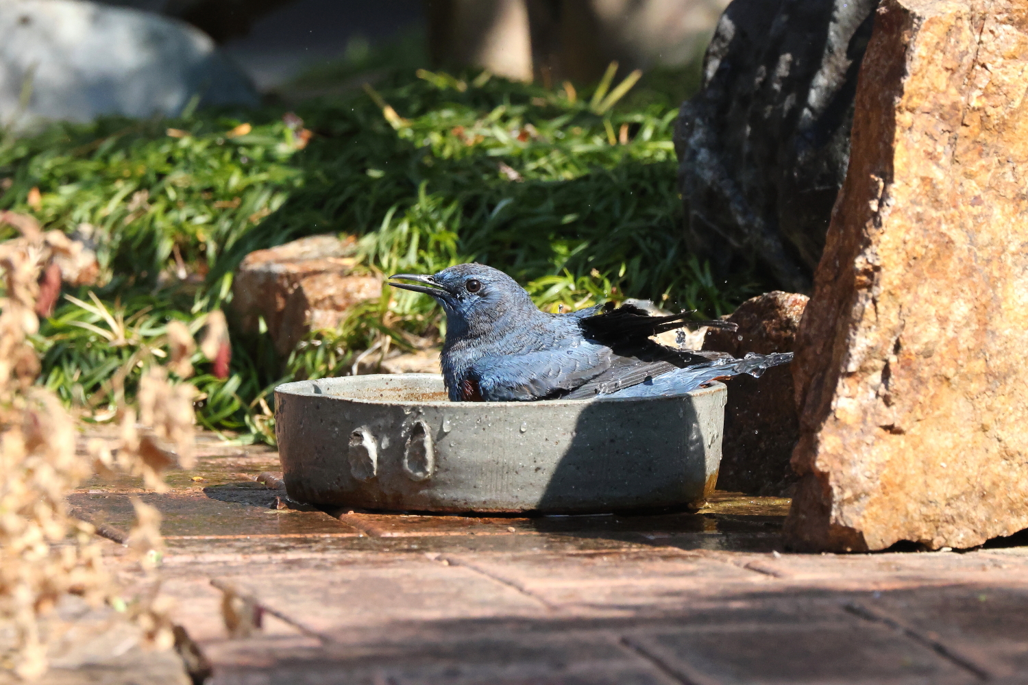 ☆お庭で念入りに水浴びをする常連の「イソヒヨドリ♂」