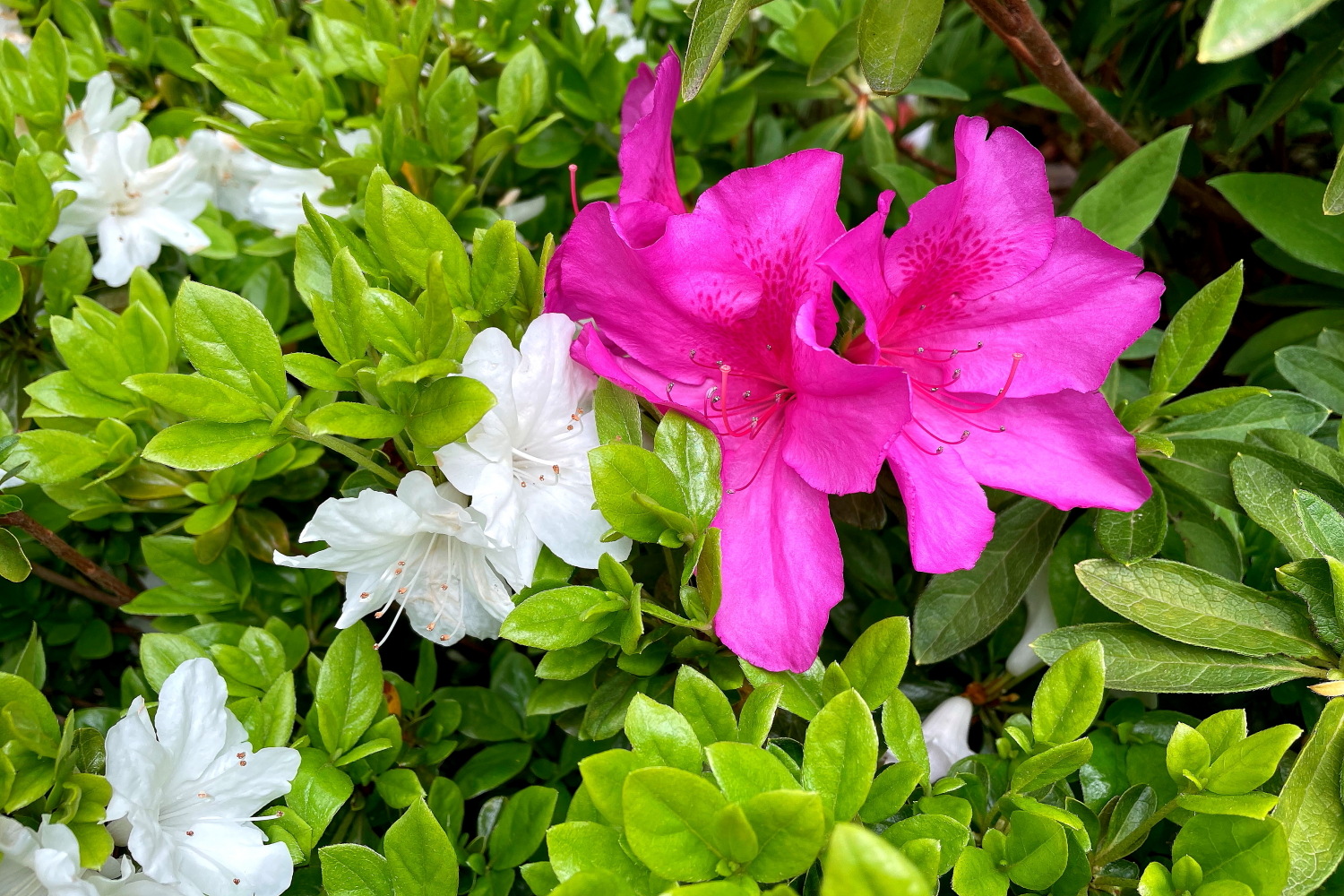☆お庭で咲いている赤い「ヒラドツツジ」と白い「キリシマツツジ」