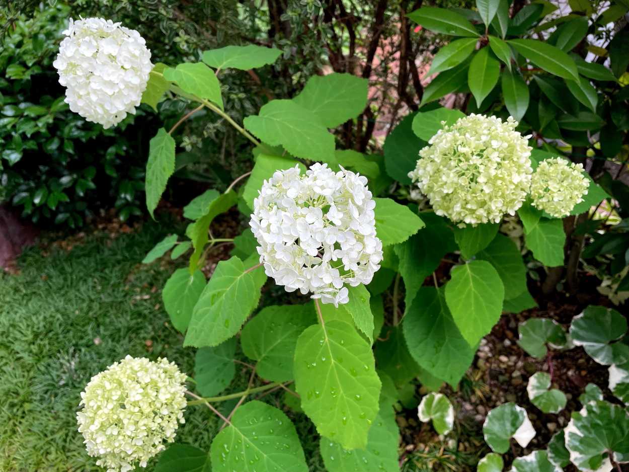 (本日更新1)我が家のお庭に3年前に挿し芽しておいたアメリカあじさいの「アナベル」が、4年目の今年は、小さいながらも5房の花房をつけてくれました(^-^)