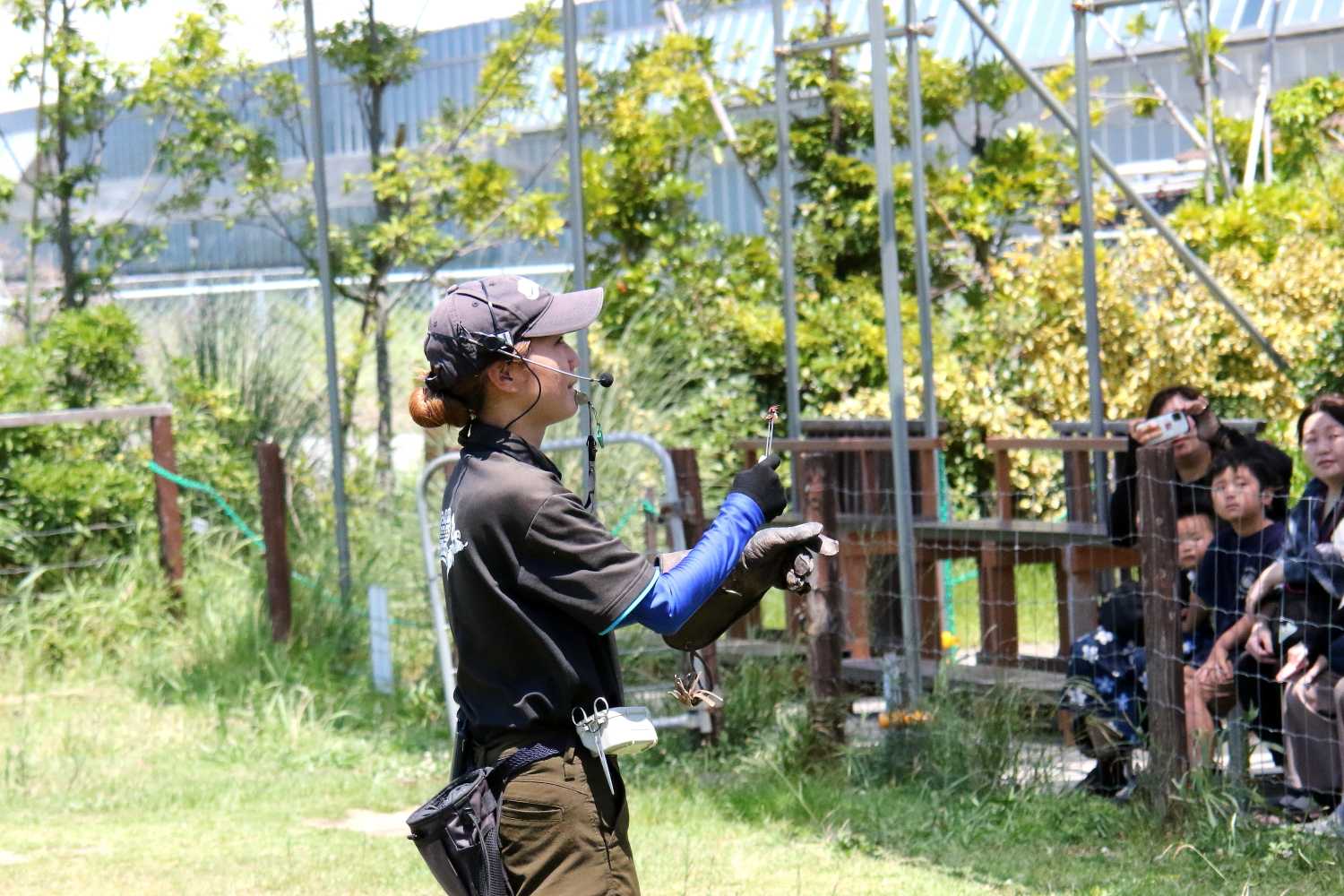 ☆パフォーマンス中に脱走した「シロオオタカ」 【シロオオタカ(白大鷹):タカ目タカ科 TL:♂約50cm・♀約56.5cm】 <英名: White Northern Goshawk> スタッフの腕に留まらず脱走したシロオオタカ 044A8467