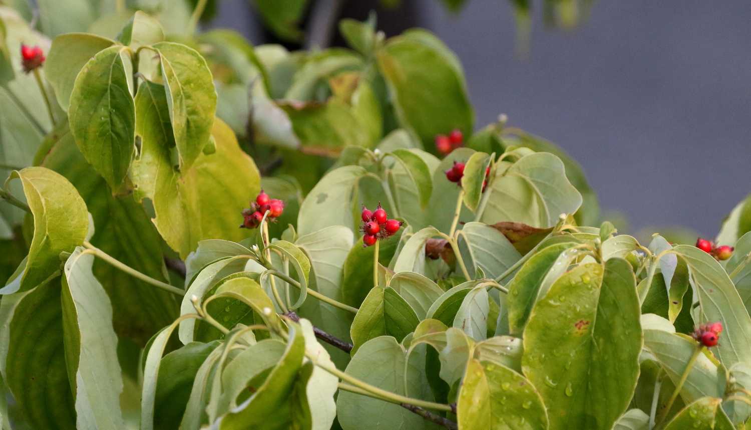 ☆お庭でまだ小さい実ながら赤く色づき始めた「ハナミズキの実」