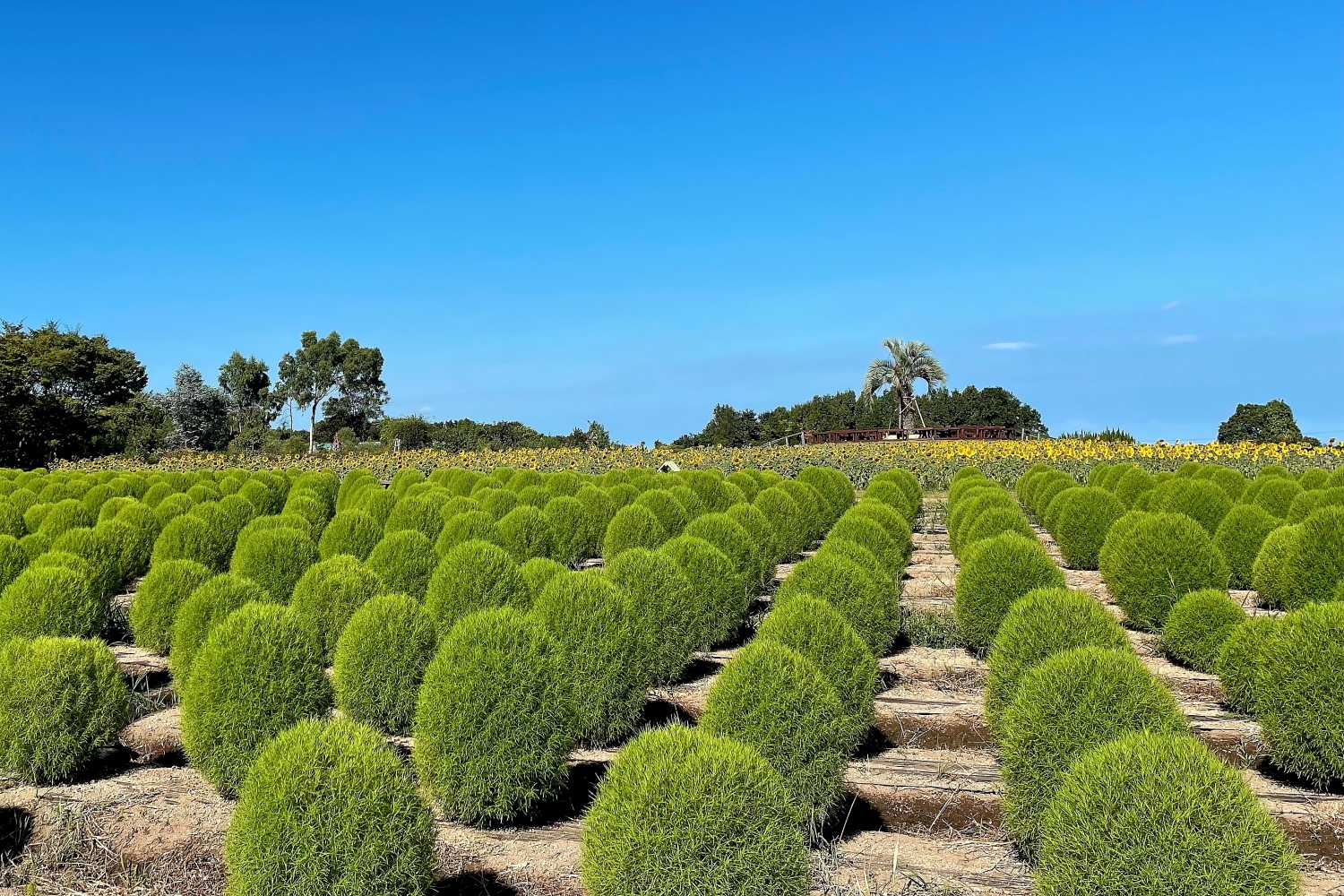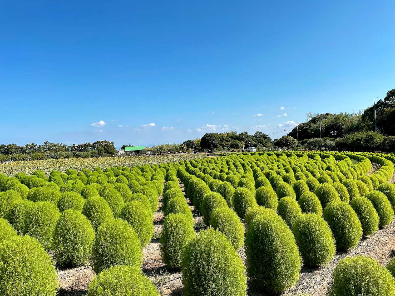 コキアはまだ先ですが、秋にかけて緑コキアから紅葉して赤コキアになり、最後は黄金コキアへと色が移り変わっていくので、コキア畑の季節のグラデーションの変化が楽しめます(^-^)