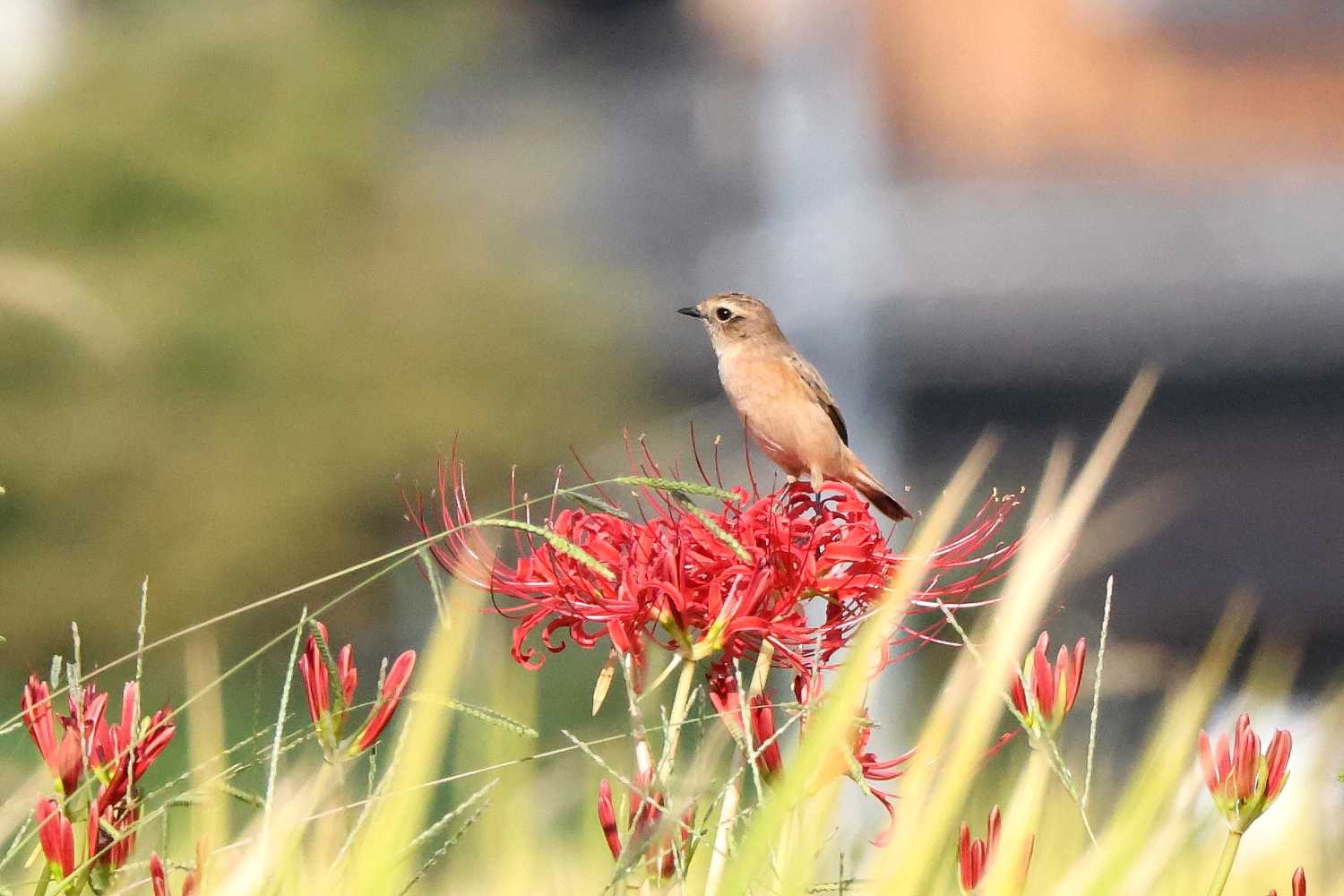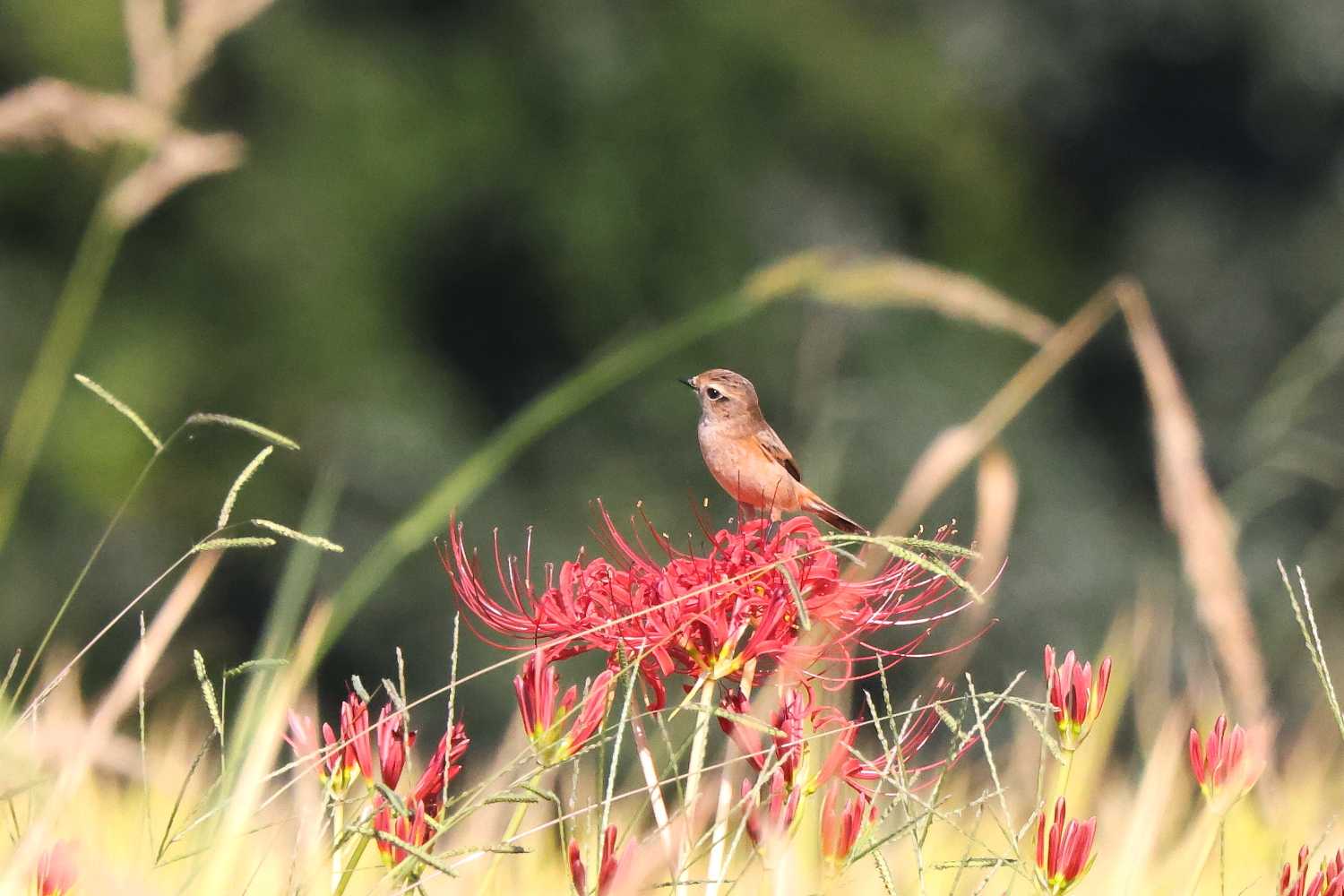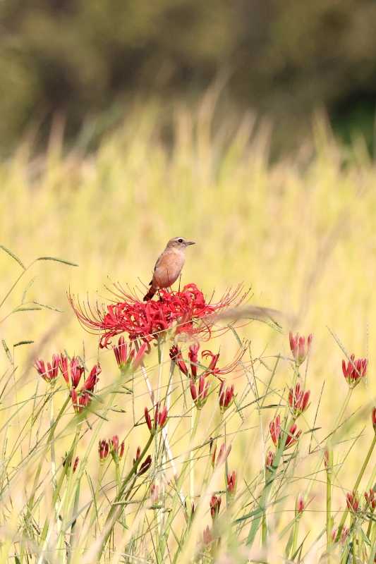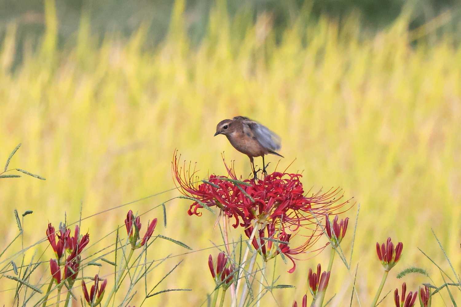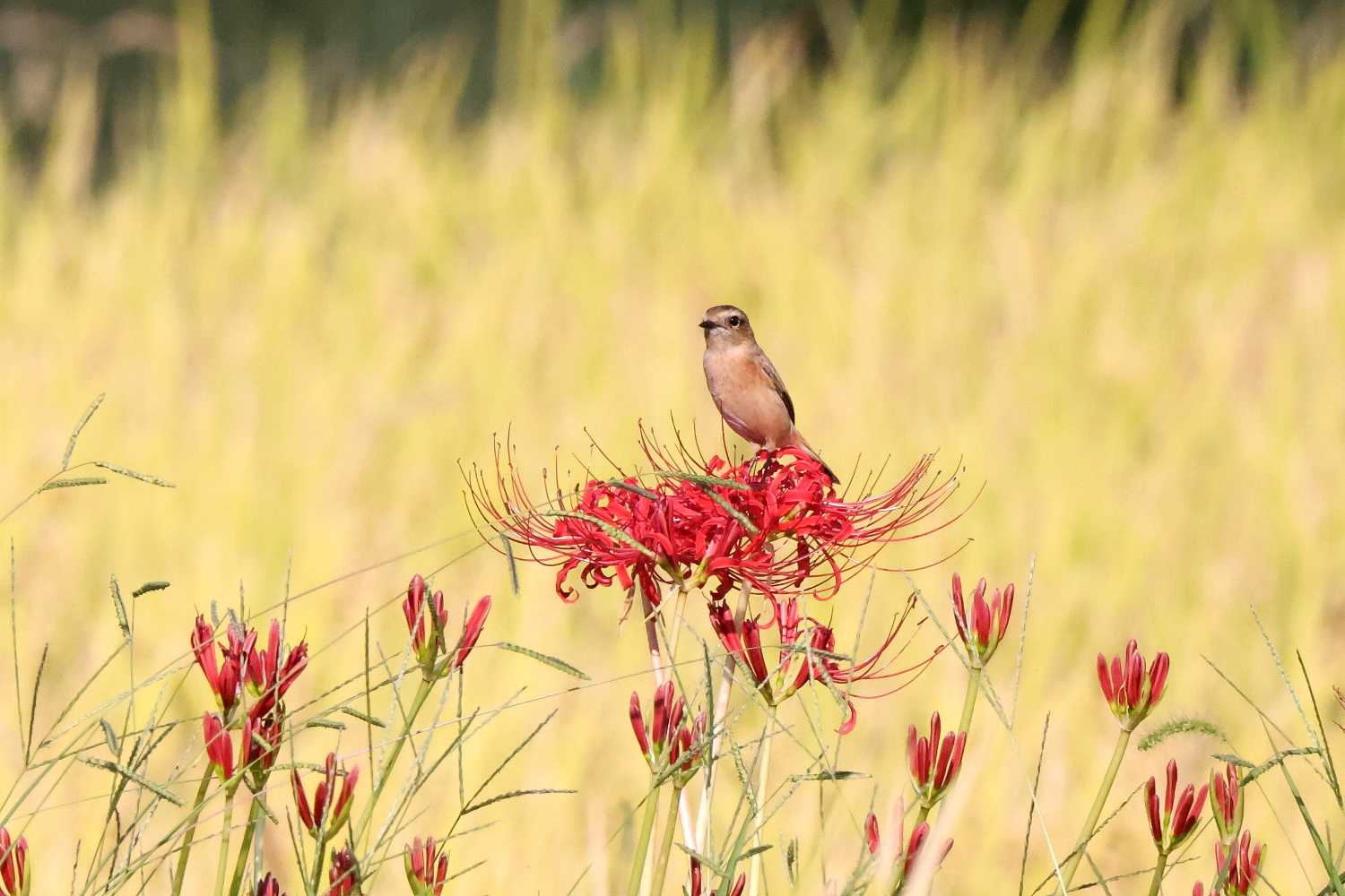 ☆堺市の田園地帯でうまく彼岸花に留まってくれた「彼岸ノビタキ」