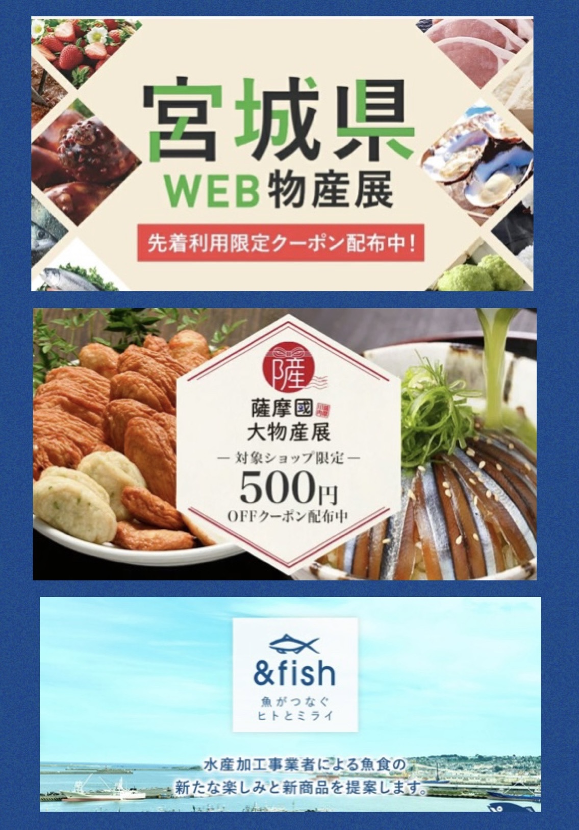 増えていたので 整えておきます【魚🐟】(11店舗)★20%オフクーポン【鹿児島県】薩摩國★3000円以上500円オフクーポン【宮城県】★20%オフクーポン(お米)31店舗【上限】★20%オフクーポン(お米以外)135店舗【上限】食材王国みやぎプラザ★20%オフクーポン 1店舗【長野県】NAGANOマルシェ★2000円以上10%オフクーポン(10日限り)【鹿児島県】枕崎市地場マルシェ★20%オフクーポン【山形県】寒河江市↑ショップに色々クーポン有メルマガ登録しておくと早くに取得出来ます残数確認用自治体公式・店舗公式のみでメルマガ、対象者限定クーポンは貼っておりません【大分県】★20%オフクーポン(佐伯市)【兵庫県】ひょうごオンライン物産展わが街とくさん店★7%オフクーポン★3000円以上1000円オフクーポンひょうごマニア★3980円以上20%オフクーポン↑以前からありました【愛媛県】愛媛百貨店★3980円以上10%オフクーポン(蜜柑.米.カタログ)29店舗【上限】★3500円以上20%オフクーポン(その他)162店舗【上限】★3980円以上25%オフクーポン(宝石.菓子.食器)69店舗今治市★3000円以上300円オフクーポン宇和島市★3000円以上500円オフクーポン【上限】【北海道】★30%オフクーポン海外系【スペイン産オリーブオイル】★1000円以上500円オフクーポン漏れがあったら追記します