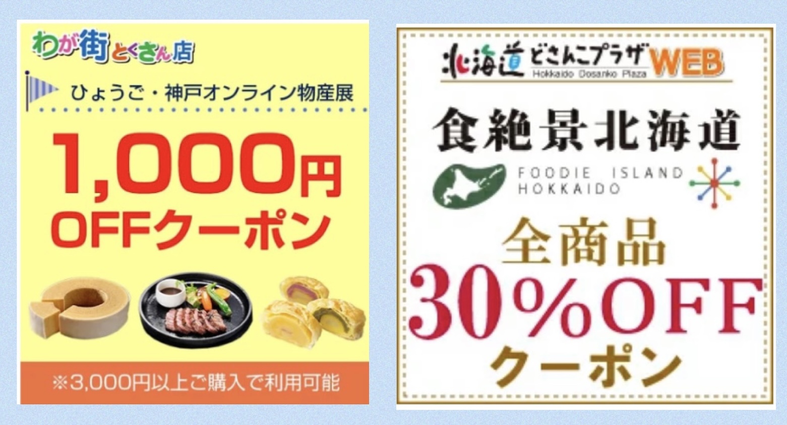 【北海道】★30%オフクーポン【兵庫県】ひょうご 神戸オンラインわが街とくさん店★7%オフクーポン★3000円以上1000円オフクーポンひょうごマニア★3980円以上20%オフクーポン↑以前からありました【魚🐟】(11店舗)★20%オフクーポン残数確認用自治体公式・店舗公式のみでメルマガ、対象者限定クーポンは貼っておりません【鹿児島県】薩摩國★3000円以上500円オフクーポン【宮城県】★20%オフクーポン(お米)31店舗【上限】★20%オフクーポン(お米以外)135店舗【上限】食材王国みやぎプラザ★20%オフクーポン 1店舗【鹿児島県】枕崎市地場マルシェ★20%オフクーポン【山形県】寒河江市↑ショップに色々クーポン有メルマガ登録しておくと早くに取得出来ます【大分県】★20%オフクーポン(佐伯市)海外系【スペイン産オリーブオイル】★1000円以上500円オフクーポン漏れがあったら追記します
