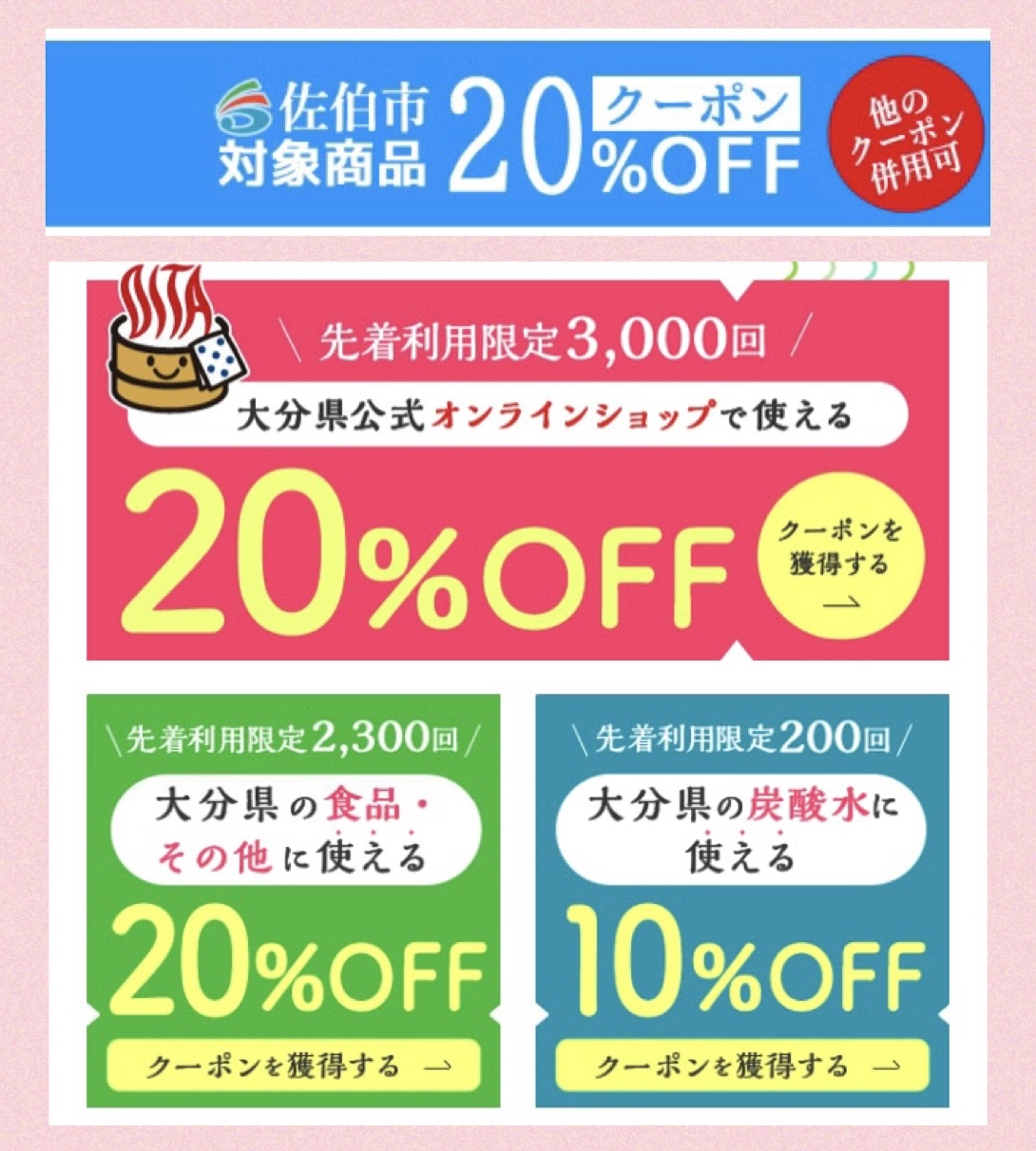 ↓佐伯20%が追加発行↓わが街とくさん店 7% 追加【大分県】🔴20%オフクーポン★20%オフクーポン(佐伯)【上限】🔵20%オフクーポン(1店舗)★20%オフクーポン(66店舗)★10%オフクーポン(炭酸水・7店舗)【上限】🔴 + 🔵 = 40%オフ【兵庫県】わが街とくさん店★7%オフクーポンひょうごマニア★3980円以上20%オフクーポン【長野県】NAGANOマルシェ(2/10限定)★2000円以上10%オフクーポン【残数確認用】自治体公式・店舗公式のみでメルマガ、対象者限定クーポンは貼っておりません【京都府】日本のよいもの市 京都の伝統産業★3980円以上1000円オフクーポン【陶器市】陶器市TOPザッとしか調べていないけれど店舗発行のクーポンありますよ【鹿児島県】枕崎市枕崎地場マルシェ2000円以上で送料無料★20%オフクーポン【福島県】旬食福来★10%オフクーポン(お米)★15%オフクーポン(お米以外)【山形県】寒河江市↑今回も 色々出ると思いますメルマガ登録しておくと 早くに取得出来ます【静岡県】焼津市★3000円以上1000円オフクーポン★5000円以上2000円オフクーポン【上限】【富山県】富山WEB物産展(78店舗)★3000円以上1000円オフクーポンとやまいきいきmarket(1店舗)★3000円以上1000円オフクーポン【鹿児島県】薩摩國★3000円以上500円オフクーポン【新潟県】長岡市長岡WEB物産展★3000円以上1000円オフクーポン【上限】【静岡県】浜松市はままつ出世市場(91店舗)★30%オフクーポン【上限】はままつ出世マーケット(1店舗)★30%オフクーポン【上限】【岩手県】バーチャル物産展★3980円以上1000円オフクーポン【上限】【宮崎県】★3500円以上1000円オフクーポン【上限】【愛媛 × アースモール】愛媛のサステナブル★3500円以上15%オフクーポン【上限】★10000円以上2000円オフクーポン【上限】漏れがあったら追記します