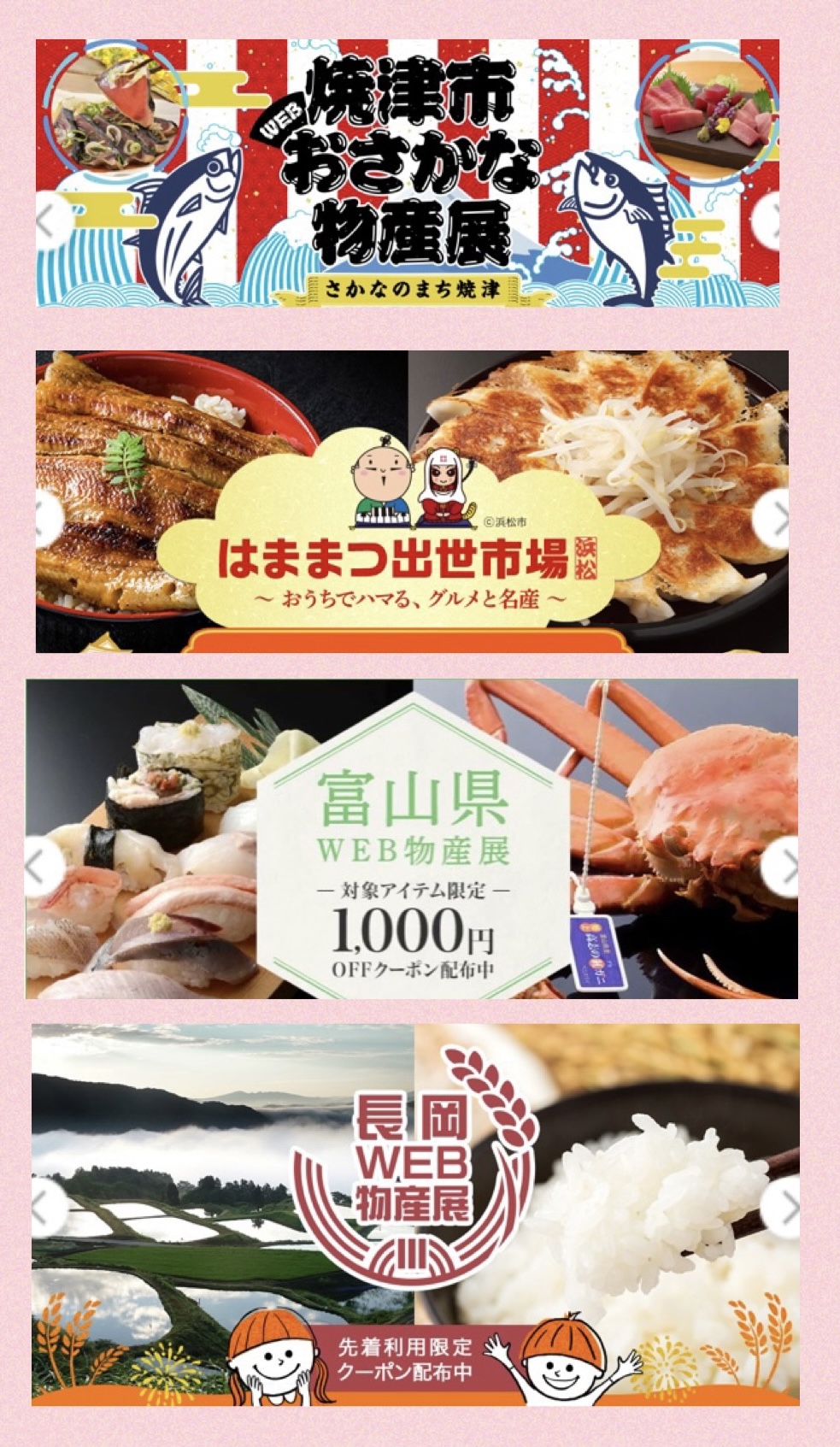 【京都】日本のよいもの市 京都の伝統産業★3980円以上1000円オフクーポン【陶器市】陶器市TOPザッとしか調べていないけれど店舗発行のクーポンありますよ【残数確認用】自治体公式・店舗公式のみでメルマガ、対象者限定クーポンは貼っておりません【兵庫県】わが街とくさん店★7%オフクーポンひょうごマニア★3980円以上20%オフクーポン【鹿児島県】枕崎市枕崎地場マルシェ2000円以上で送料無料★20%オフクーポン【福島県】旬食福来★10%オフクーポン(お米)★15%オフクーポン(お米以外)【山形県】寒河江市↑今回も 色々出ると思いますメルマガ登録しておくと 早くに取得出来ます【静岡県】焼津市★3000円以上1000円オフクーポン★5000円以上2000円オフクーポン【上限】【静岡県】浜松市はままつ出世市場(91店舗)★30%オフクーポン【上限】はままつ出世マーケット(1店舗)★30%オフクーポン【富山県】富山WEB物産展(78店舗)★3000円以上1000円オフクーポンとやまいきいきmarket(1店舗)★3000円以上1000円オフクーポン【新潟県】長岡市長岡WEB物産展★3000円以上1000円オフクーポン【上限】【魚🐟】(11店舗)★20%オフクーポン【鹿児島県】薩摩國★3000円以上500円オフクーポン【岩手県】バーチャル物産展★3980円以上1000円オフクーポン【上限】【宮崎県】★3500円以上1000円オフクーポン【上限】【愛媛 × アースモール】愛媛のサステナブル★3500円以上15%オフクーポン【上限】【新規店】★3000円以上600円オフクーポン【上限】★5000円以上1000円オフクーポン【上限】★10000円以上2000円オフクーポン【上限】漏れがあったら追記します
