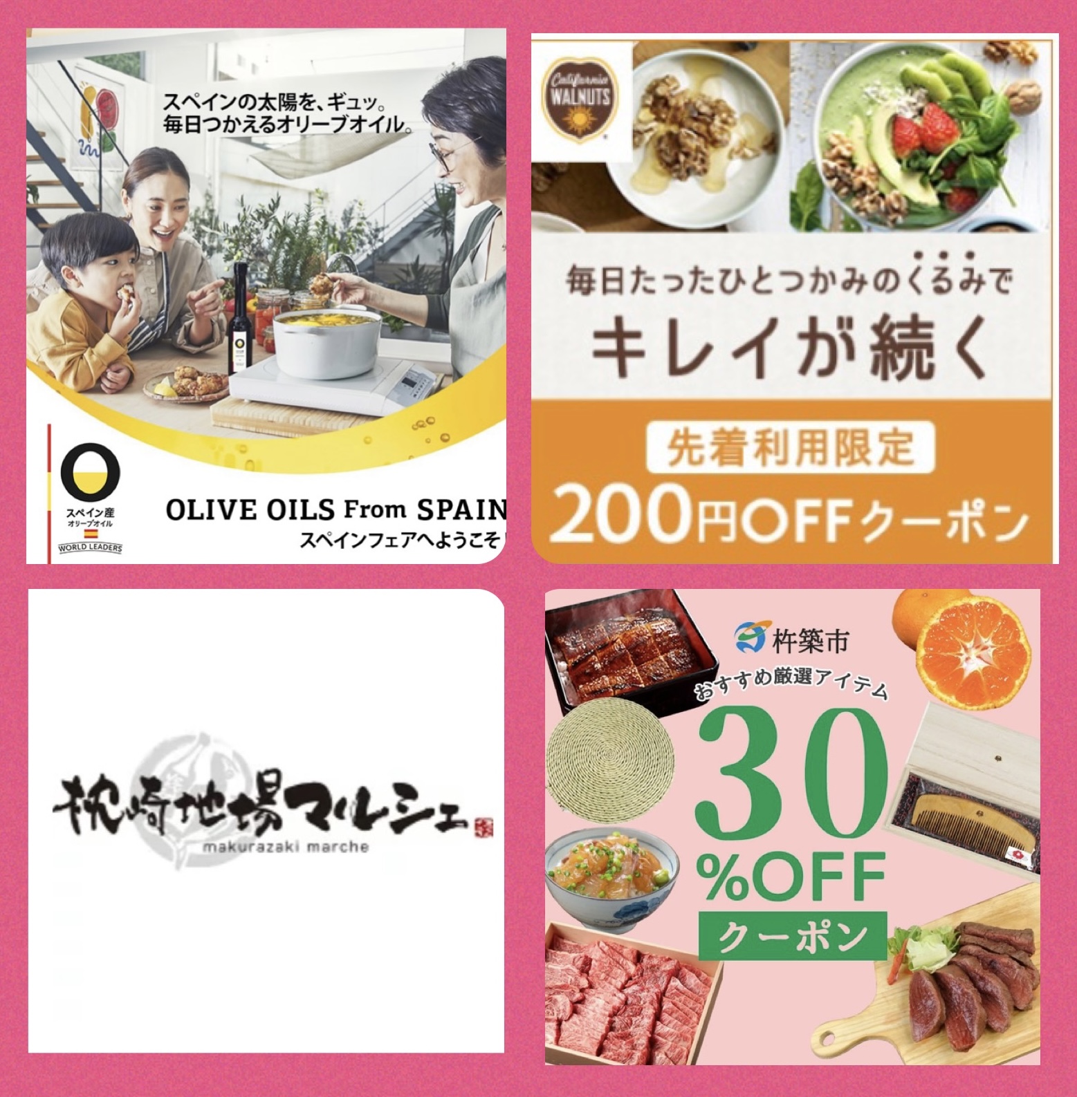 追記↓【鹿児島県】枕崎市枕崎地場マルシェ★20%オフクーポン海外系【カリフォルニア】くるみ★1000円以上200円オフクーポン【スペイン フェア】オリーブオイル★1000円以上500円オフクーポン★2000円以上1000円オフクーポン【大分県】杵築市★30%オフクーポン漏れがあったら追記します