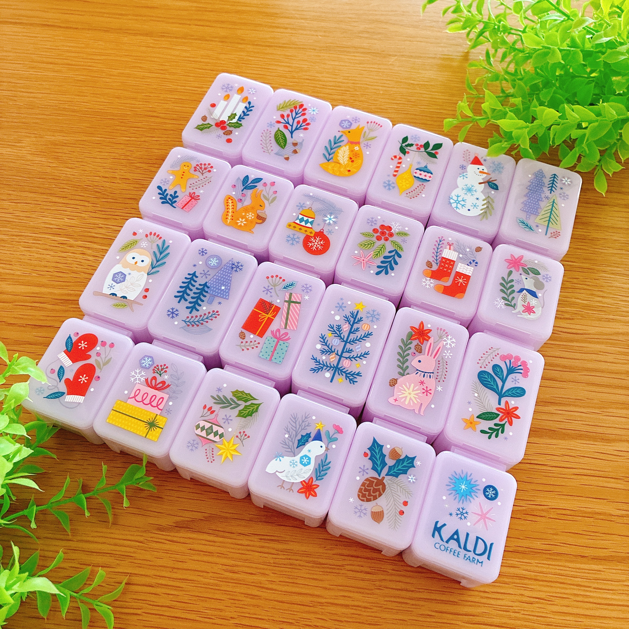 カルディのアドベントカレンダーが可愛い#PR店員さん曰くこのタイプは 今年初めて今日(11/1)入荷の商品らしいです厚みのあるピルケースみたいな感じでプラスチック製ピンク系紫みたいな色合いですお菓子も入っているしケースも使えるなんて素敵税込み1408円ってお財布にも優しい👛大人(私)がテンション上がっちゃって衝動買いしましたがwお子さんやお孫さんにも喜ばれるなぁ〜と思いました帰宅してから 即撮影しましたほっこりする絵柄全部バラバラになって縦横 繋げられるんです商品名は『たてこよつながるカウントダウンボックス』12/1〜24に 1個ずつ食べるから24マスなのねー#カルディ#クリスマス#アドベントカレンダー